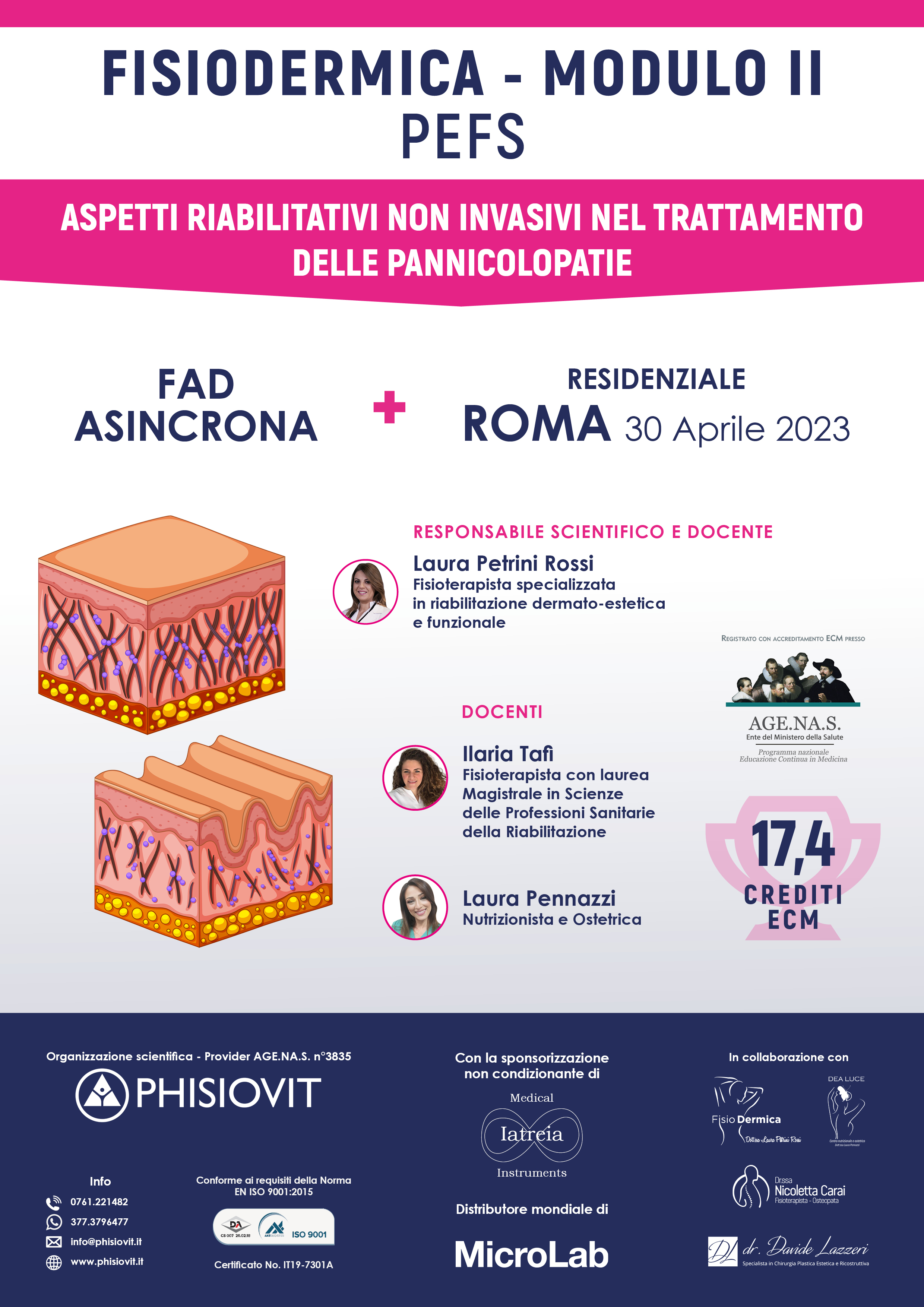 Il corso "Trattamento non Invasivo della PEFS e delle Pannicolopatie" vede la presenza tra i relatori dei maggiori esperti di settore e nasce con l'obiettivo di favorire lo studio e la pratica clinica dei professionisti sanitari che intervengono in qualità di discenti. Si svolge parte on line e parte in presenza attraverso l'esposizione delle relazioni dei docenti: la successiva discussione che ne nasce attraverso l'elaborazione della valutazione funzionale più utile e del trattamento terapeutico più idoneo, alla luce del paradigma dell'Evidence Based Practice, migliora nettamente le abilità del partecipante favorito anche dal brain storming prima in aula virtuale e poi in aula fisica. Il corsista stesso può anche esporre i dubbi insorti in itinere durante gli incontri in presenza e a distanza così da aumentare, attraverso l'interazione diretta con i relatori e con la classe stessa, l'esperienza e la sicurezza in materia di riabilitazione dermato-estetica e funzionale.