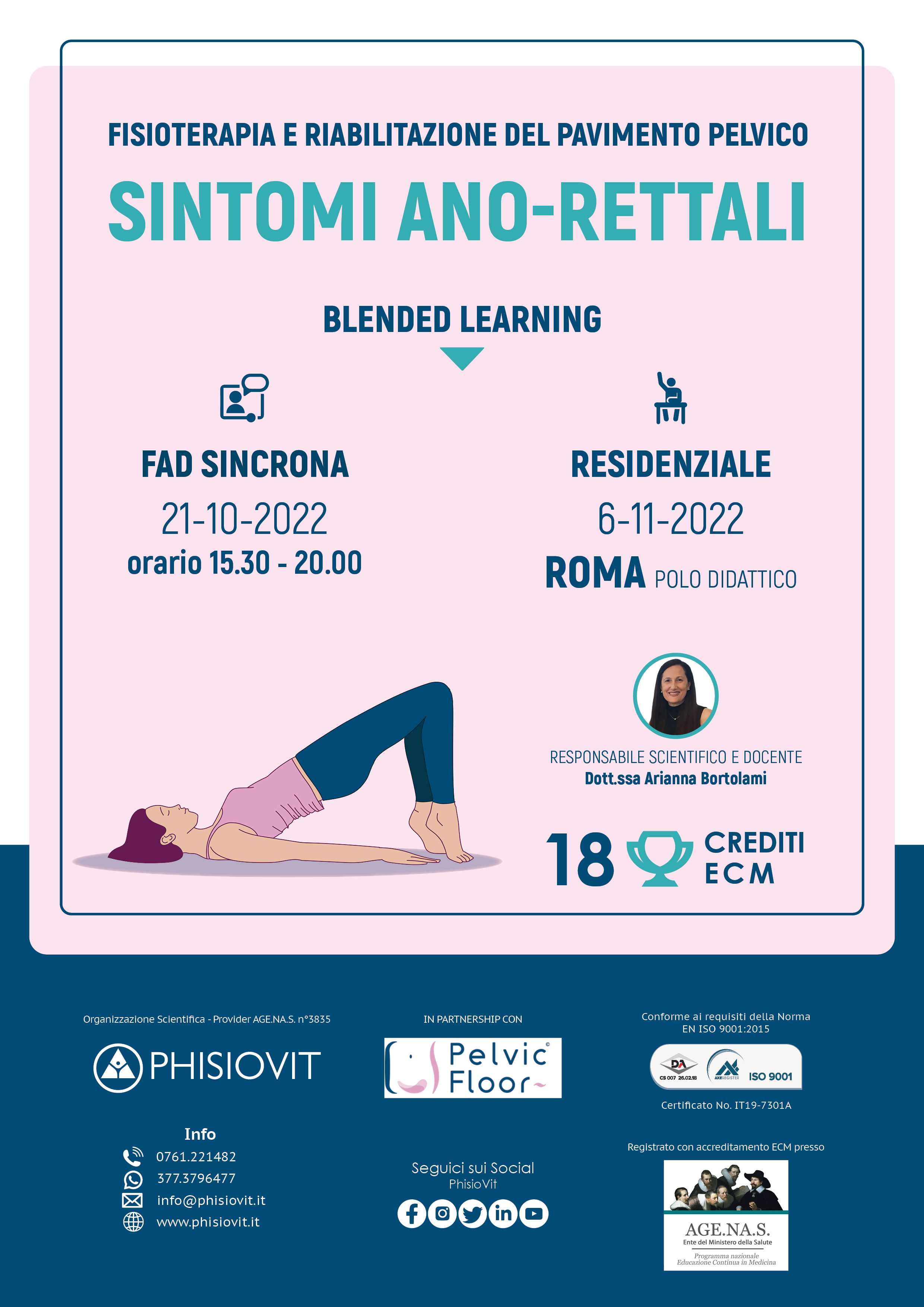 Questo progetto didattico dal titolo "Fisioterapia e Riabilitazione del Pavimento Pelvico per i Sintomi Ano-Rettali" interamente curato dalla Dott.ssa Arianna Bortolami è in versione blended, ovvero prevede tutta la teoria in modalità FAD sincrona e tutta la pratica in modalità residenziale in aula. Si tratta di un evento rivolto alle classi di medicina e riabilitazione ed include le strategie riabilitative per quei sintomi ano-rettali come l'incontinenza anale e fecale, l'urgenza fecale, la stipsi o il dolore anale che possono determinare un'alterazione della qualità della vita in chi ne soffre, talvolta in modo anche grave. Questi soggetti riferiscono sensazioni di imbarazzo, frustrazione, disagio nei confronti dell'ambiente circostante e presentano limitazioni alla vita sociale spesso determinanti ai fini relazionali. Le cause di questi sintomi possono talvolta comprendere anche i muscoli del pavimento pelvico: è indicata pertanto in questi casi la fisioterapia e la riabilitazione del pavimento pelvico stesso che, attraverso le tecniche e gli strumenti propri di questa branca della fisioterapia, può determinare positivi cambiamenti negli aspetti compromessi della vita del paziente.