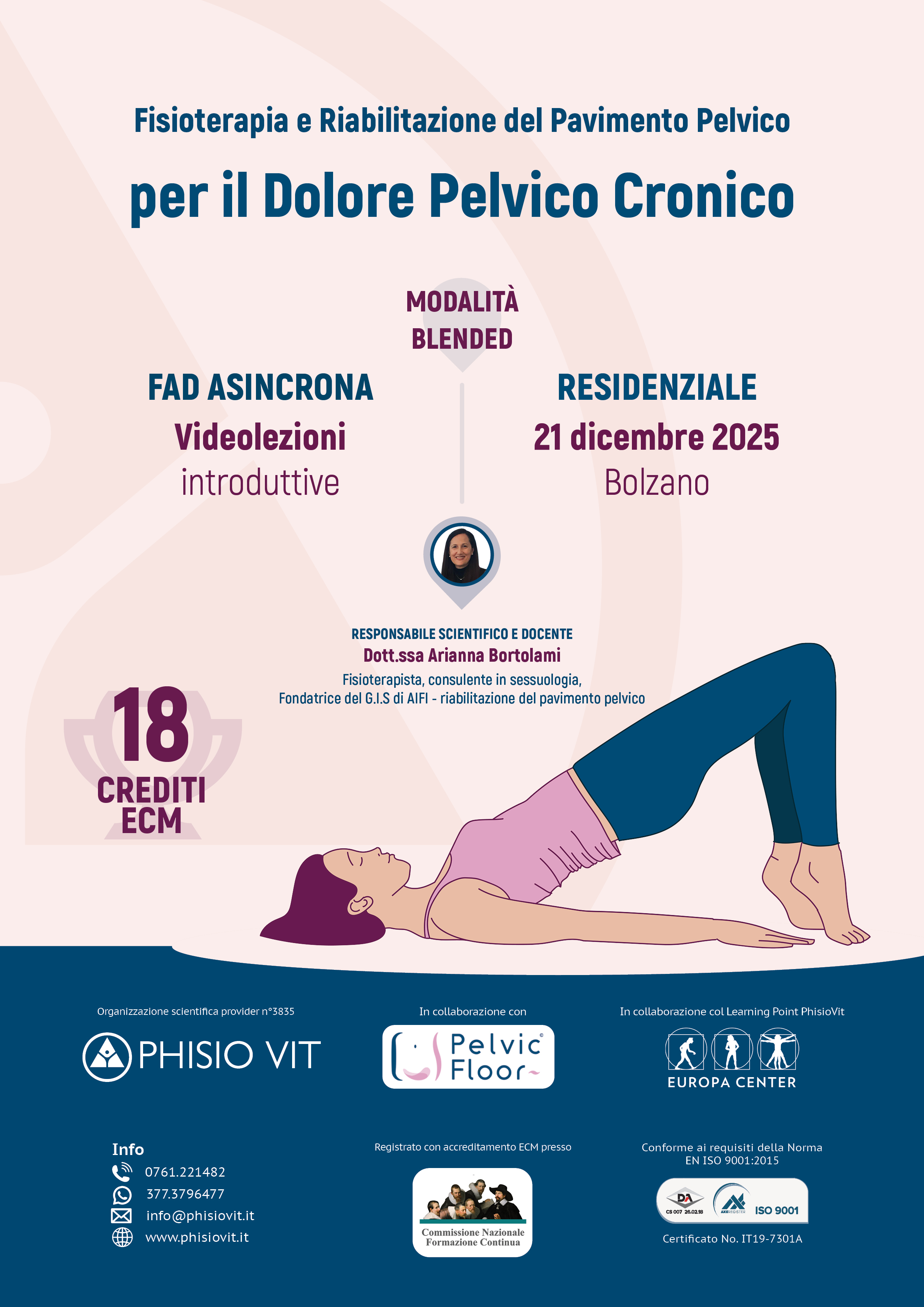 - STEP 1: si inizia con una FAD asincrona relativa a fisioterapia e riabilitazione del pavimento pelvico per il dolore pelvico cronico che contiene tutta la teoria esposta dalla docente in video lezioni. In questa fase vengono anche consegnate dispense per studio e approfondimento. Questa formazione serve a introdurre all'argomento il partecipante, resta nella sua disponibilità all'interno del proprio pannello di controllo in piattaforma didattica ed è accessibile da qualsiasi dispositivo. Può essere iniziata, ripresa e interrotta quando e quante volte si vuole ma comunque completata prima dello STEP 2 illustrato qui di seguito.