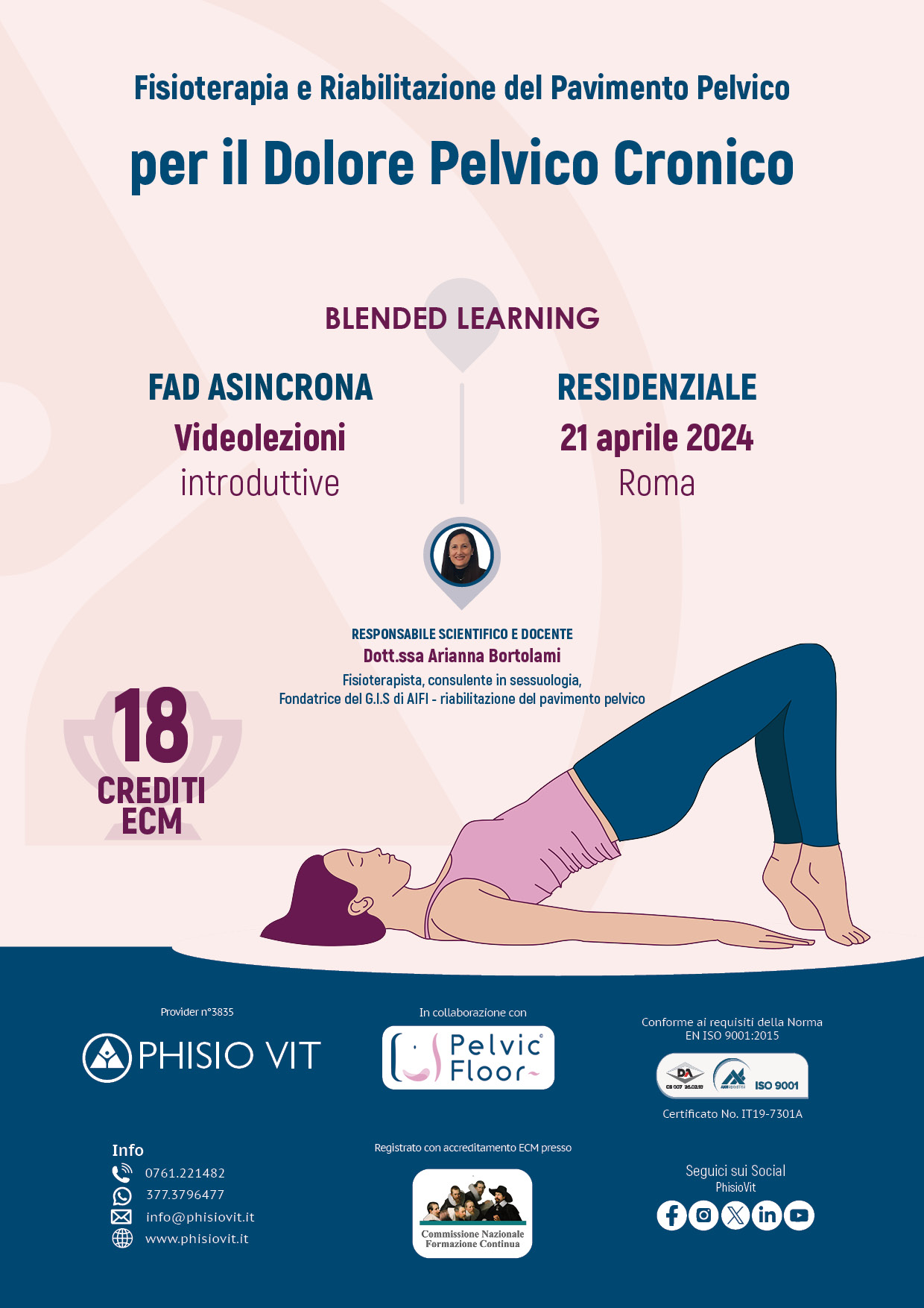 - STEP 1: si inizia con una FAD asincrona relativa a fisioterapia e riabilitazione del pavimento pelvico per il dolore pelvico cronico che contiene tutta la teoria esposta dalla docente in video lezioni. In questa fase vengono anche consegnate dispense per studio e approfondimento. Questa formazione serve a introdurre all'argomento il partecipante, resta nella sua disponibilità all'interno del proprio pannello di controllo in piattaforma didattica ed è accessibile da qualsiasi dispositivo. Può essere iniziata, ripresa e interrotta quando e quante volte si vuole ma comunque completata prima dello STEP 2 illustrato qui di seguito.