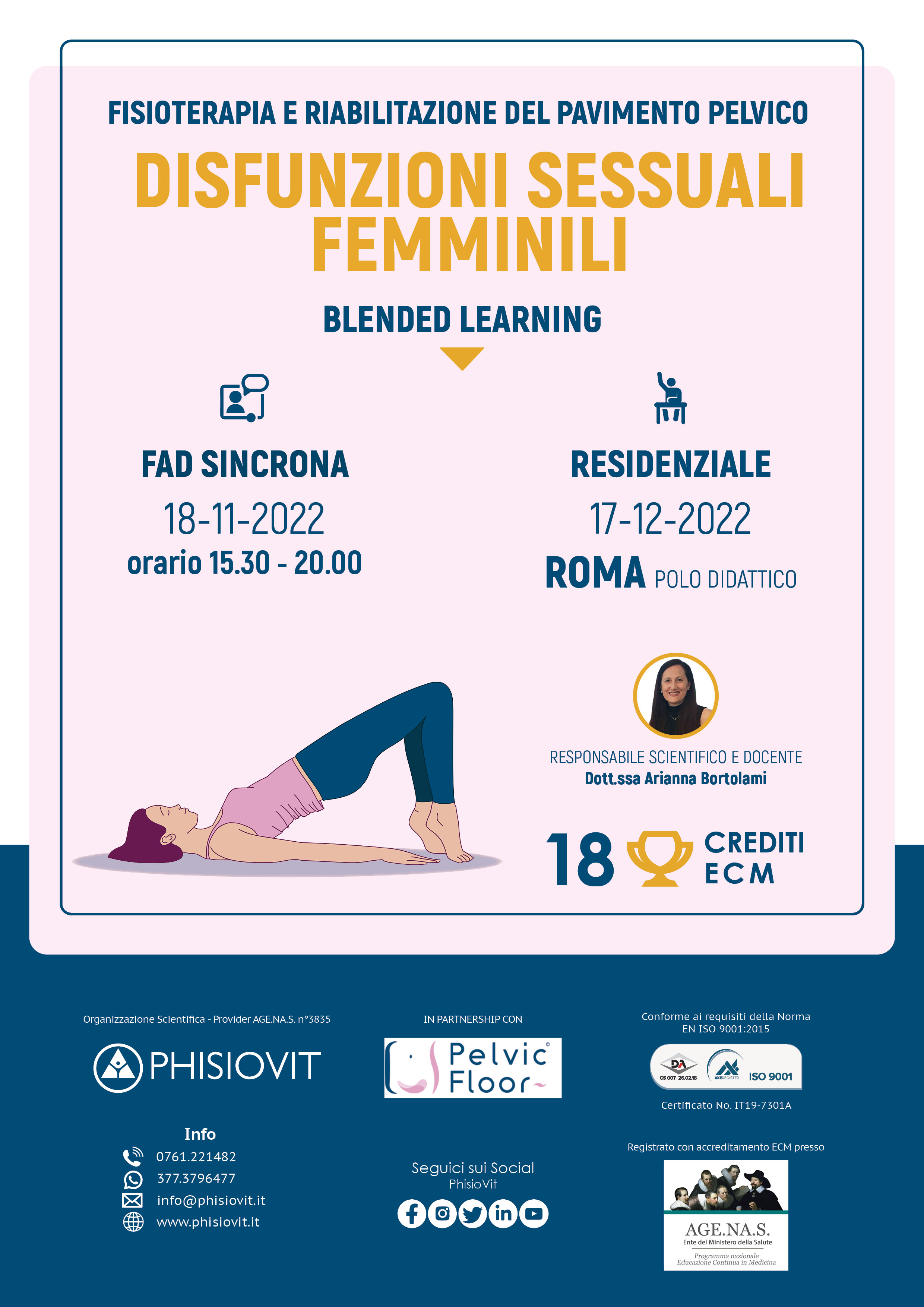 Questo progetto didattico dal titolo "Fisioterapia e Riabilitazione del Pavimento Pelvico per le Disfunzioni Sessuali Femminili" interamente curato dalla Dott.ssa Arianna Bortolami è in versione blended, ovvero prevede tutta la teoria in modalità FAD sincrona e tutta la pratica in modalità residenziale in aula. Si tratta di un evento specifico per questo tipo di disfunzioni, le quali costituiscono un sintomo che può peggiorare in modo importante la qualità di vita della donna e, di conseguenza, del partner e della famiglia, compromettendo così la sfera personale e talvolta sociale della donna stessa che ne soffre. In alcuni casi tali condizioni sono così gravi da impedire la maternità, danneggiando ulteriormente la vita della donna e di chi le vive accanto. Il riconoscimento delle disfunzioni sessuali femminili presuppone conoscenze nell'ambito della sessuologia, disciplina che si è sviluppata negli ultimi decenni. Il pavimento pelvico costituisce uno degli elementi della funzione sessuale e la sua compromissione può essere causa primaria o secondaria della disfunzione sessuale: tra le varie opzioni terapeutiche è appunto compresa la fisioterapia e riabilitazione del pavimento pelvico, che è costituita da una serie di tecniche e strumenti, le quali, all'interno di un processo di ragionamento clinico e alla luce del paradigma dell'evidence based practice, permettono la gestione del sintomo relativo alla disfunzione sessuale femminile.