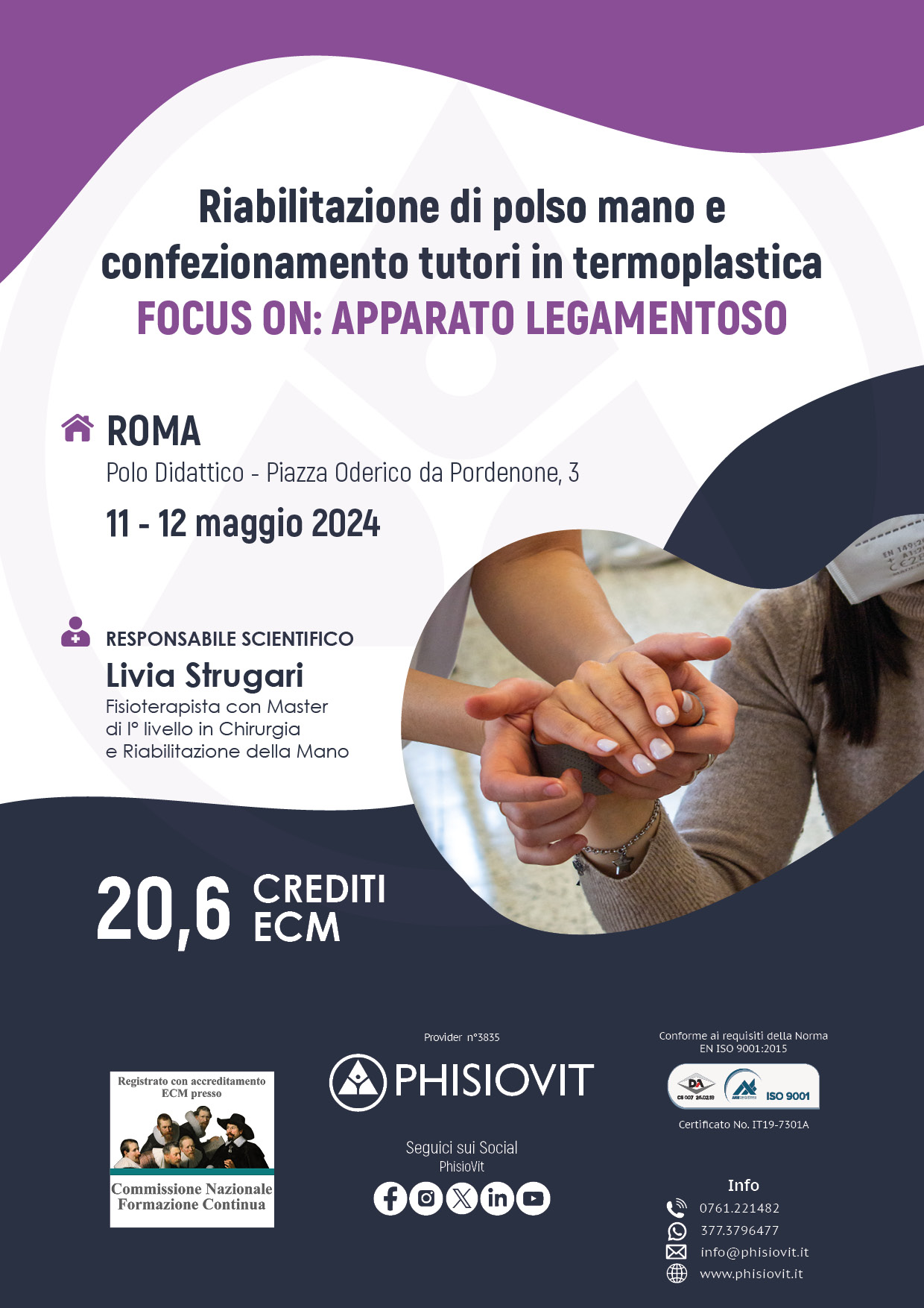 Questo evento si propone di fornire un panorama dei trattamenti fisioterapici, riabilitativi e conservativi delle patologie legamentose della mano, a cui segue una parte pratica di laboratorio dove ogni singolo partecipante apprende non solo gli esercizi e le più comuni tecniche riabilitative ma anche l'arte del confezionamento dei tutori. I contenuti del corso comprendono nozioni di anatomia, la conoscenza dei meccanismi patogenetici delle patologie legamentose più frequenti della mano, le procedure di valutazione, le metodiche di trattamento mediante tecniche manuali, di splinting, auto trattamento, taping, coban ed esercizio terapeutico.