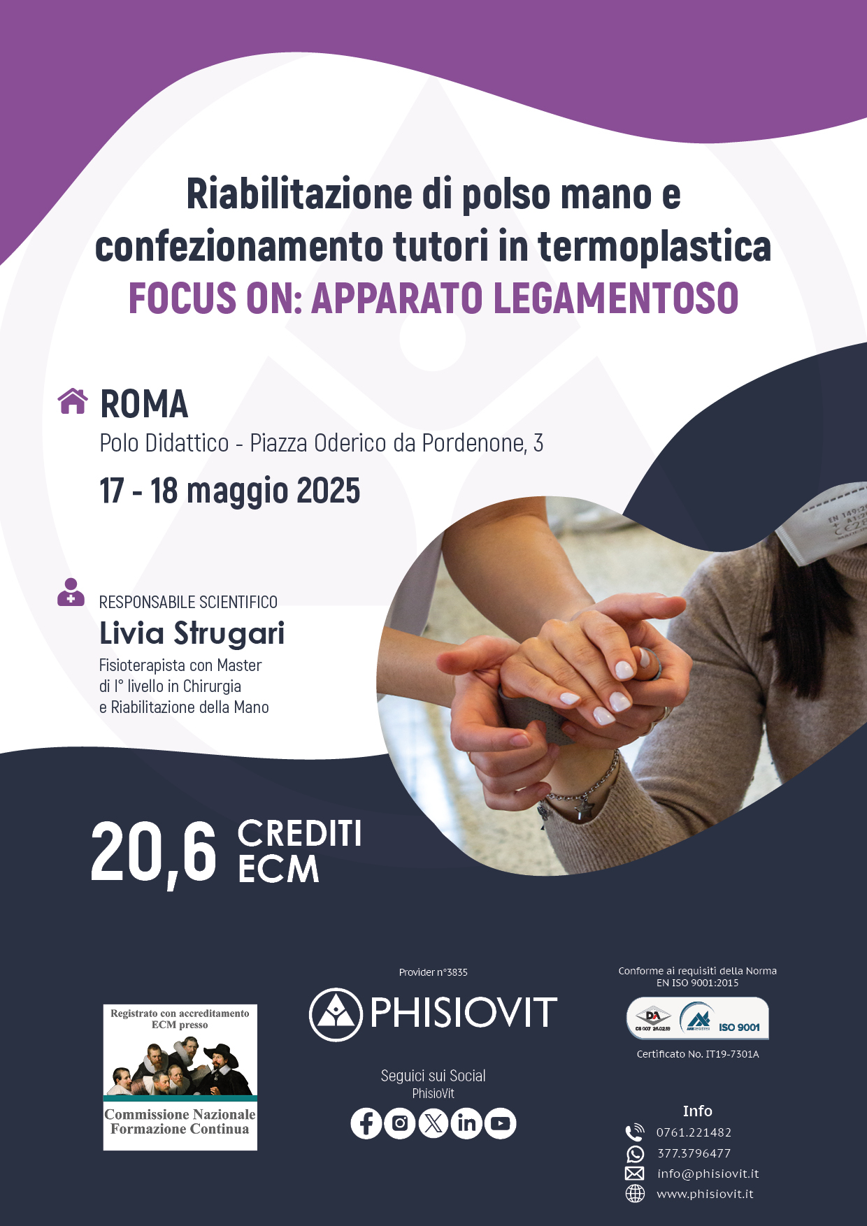 Questo evento si propone di fornire un panorama dei trattamenti fisioterapici, riabilitativi e conservativi delle patologie legamentose della mano, a cui segue una parte pratica di laboratorio dove ogni singolo partecipante apprende non solo gli esercizi e le più comuni tecniche riabilitative ma anche l'arte del confezionamento dei tutori. I contenuti del corso comprendono nozioni di anatomia, la conoscenza dei meccanismi patogenetici delle patologie legamentose più frequenti della mano, le procedure di valutazione, le metodiche di trattamento mediante tecniche manuali, di splinting, auto trattamento, taping, coban ed esercizio terapeutico.