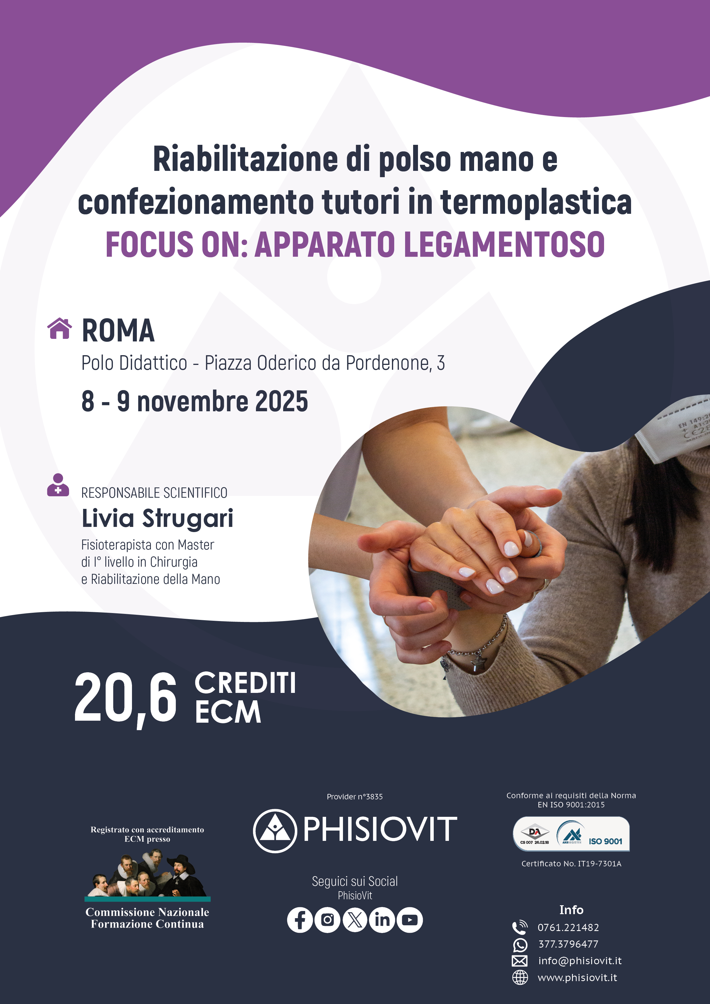 Questo evento si propone di fornire un panorama dei trattamenti fisioterapici, riabilitativi e conservativi delle patologie legamentose della mano, a cui segue una parte pratica di laboratorio dove ogni singolo partecipante apprende non solo gli esercizi e le più comuni tecniche riabilitative ma anche l'arte del confezionamento dei tutori. I contenuti del corso comprendono nozioni di anatomia, la conoscenza dei meccanismi patogenetici delle patologie legamentose più frequenti della mano, le procedure di valutazione, le metodiche di trattamento mediante tecniche manuali, di splinting, auto trattamento, taping, coban ed esercizio terapeutico.