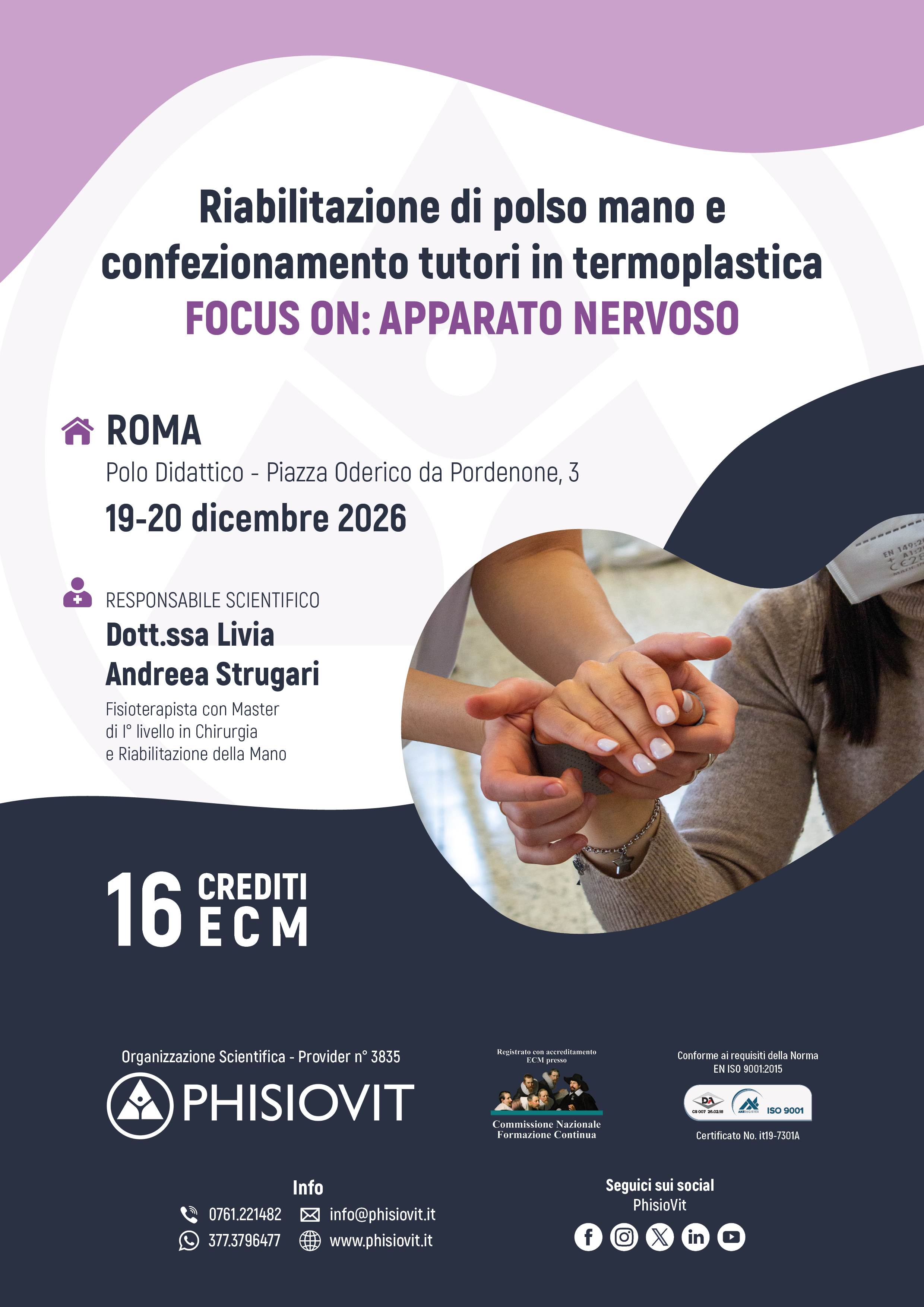 Questo evento si propone di fornire un panorama dei trattamenti fisioterapici, riabilitativi e conservativi delle patologie nervose della mano, a cui segue una parte pratica di laboratorio dove ogni singolo partecipante apprende non solo gli esercizi e le più comuni tecniche riabilitative ma anche l'arte del confezionamento dei tutori. I contenuti del corso comprendono nozioni di anatomia, la conoscenza delle sindromi compressive nervose più frequenti della mano, le procedure di valutazione, le metodiche di trattamento mediante tecniche manuali, splinting, autotrattamento, taping, coban, esercizio terapeutico e neurodinamica.