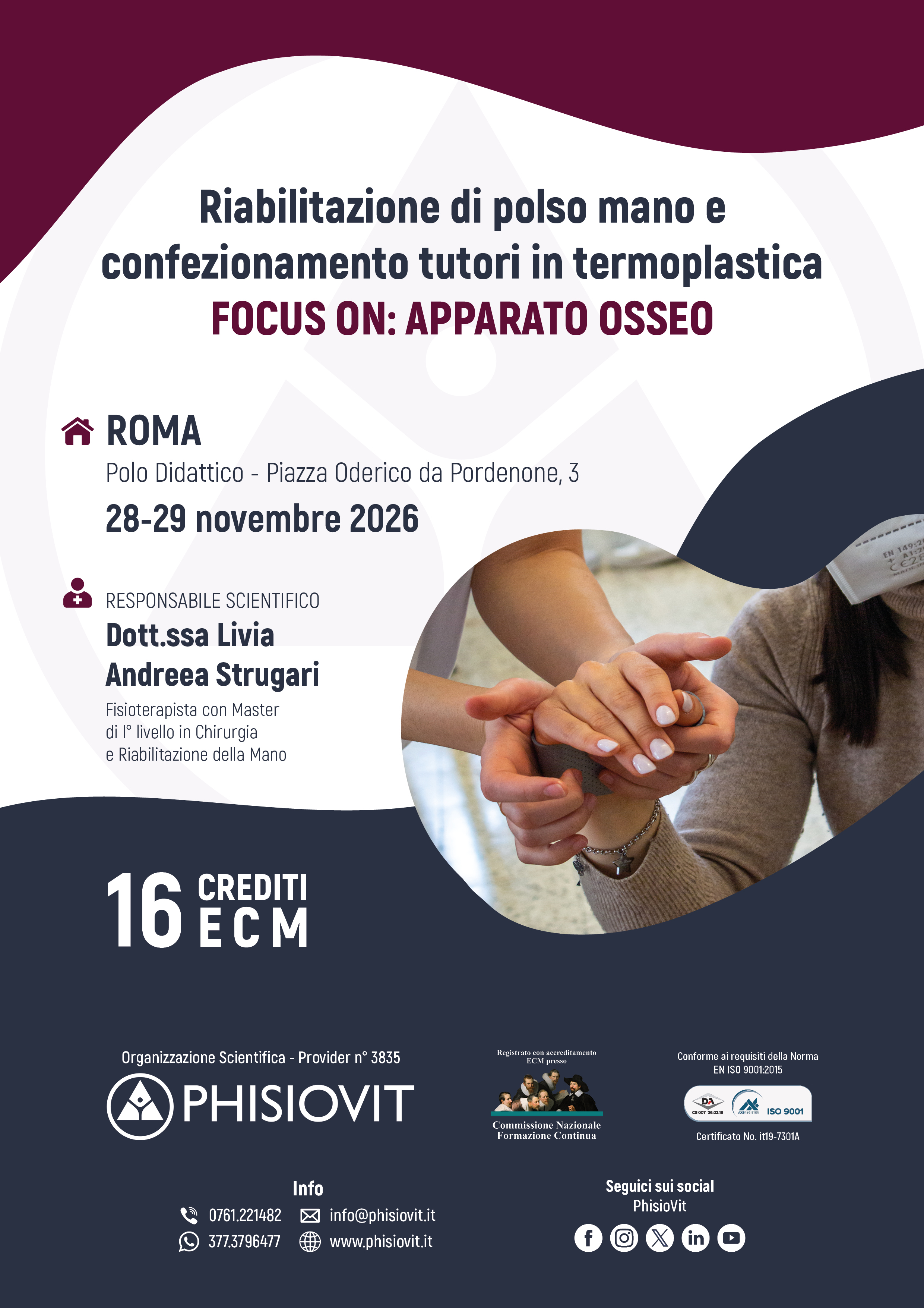 Questo evento si propone di fornire un panorama dei trattamenti fisioterapici, riabilitativi e conservativi delle patologie ossee della mano, a cui segue una parte pratica di laboratorio, dove ogni singolo partecipante apprende non solo gli esercizi e le più comuni tecniche riabilitative ma anche l'arte del confezionamento dei tutori. I contenuti del corso comprendono nozioni di anatomia, la conoscenza dei meccanismi patogenetici delle patologie ossee più frequenti della mano, le procedure di valutazione, le metodiche di trattamento mediante tecniche manuali, splinting, autotrattamento, terapia occupazionale, taping, coban ed esercizio terapeutico.