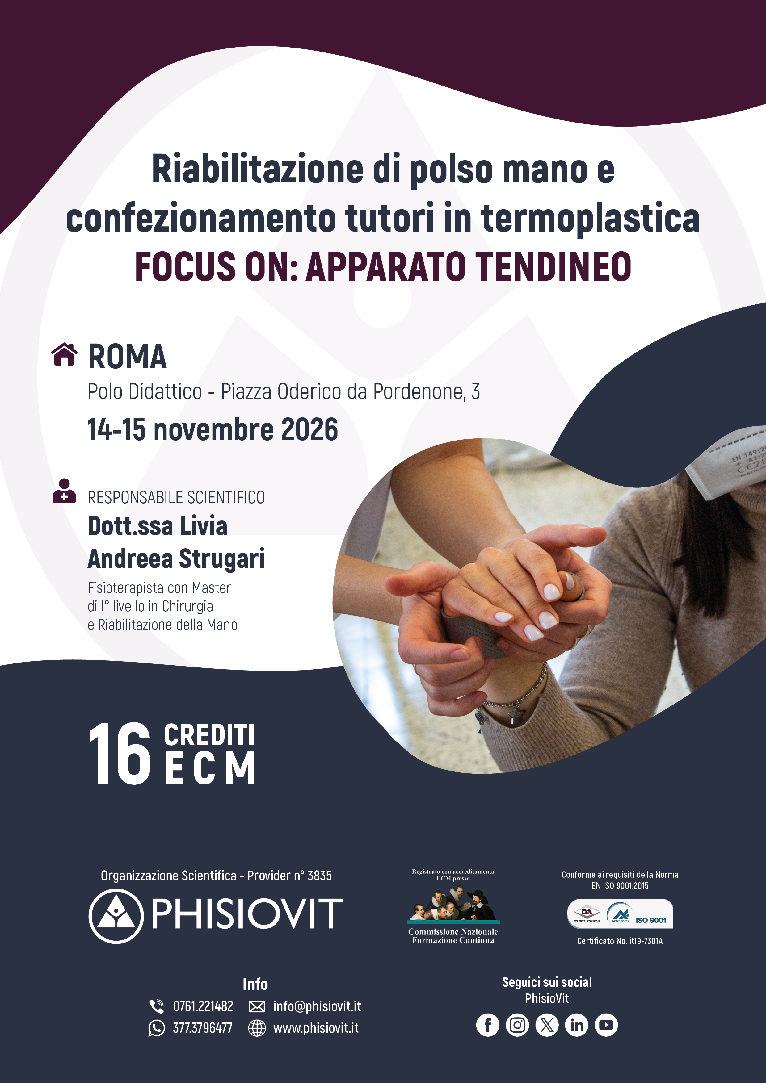 Questo evento si propone di fornire un panorama dei trattamenti fisioterapici, riabilitativi e conservativi delle patologie tendinee della mano, a cui segue una parte pratica di laboratorio dove ogni singolo partecipante apprende non solo gli esercizi e le più comuni tecniche riabilitative ma anche l'arte del confezionamento dei tutori. I contenuti del corso comprendono nozioni di anatomia, la conoscenza dei meccanismi patogenetici delle tendinopatie più frequenti della mano, le procedure di valutazione, le metodiche di trattamento mediante tecniche manuali, splinting, autotrattamento, taping, coban ed esercizio terapeutico.