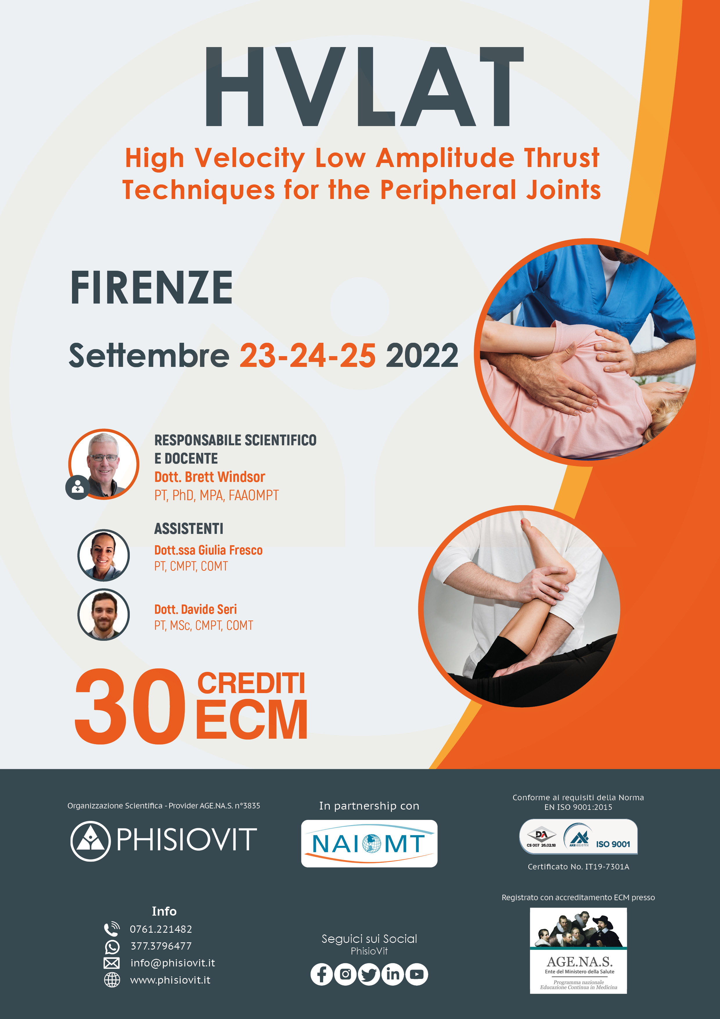 In questo corso formazione e pratica sulle HVLAT rispetto agli arti superiori ed inferiori, vengono fornite al discente in modo accurato in riferimento alla condizione muscoloscheletrica del paziente: nelle ventiquattro ore di corso vengono impartite le istruzioni dell'arte e della scienza degli interventi HVLAT per le articolazioni periferiche finalizzate alla correzione delle disfunzioni neuromuscoloscheletriche delle articolazioni di spalla, gomito, polso e mano, d'anca, di ginocchio, di caviglia e piede. Maggiore enfasi viene posta sulla selezione dei soggetti, attraverso la descrizione di pazienti modello per ciascuna tecnica: in altre parole viene prestata attenzione a identificare quei pazienti che non possono essere trattati e viene insegnato ai discenti come identificare ciascun caso. Vengono altresì incluse le evidenze più recenti nelle componenti valutative ed interventistiche col preciso scopo di porre una meticolosa attenzione su come e quando eseguire in sicurezza le tecniche HVLAT. Il materiale del corso comprende l'esposizione di pubblicazioni recenti e classiche, materiali didattici con contenuti audiovisivi accuratamente selezionati e una dispensa in inglese specificamente progettata dal responsabile scientifico e docente Brett Windsor, PT, PhD, MPA, FAAOMPT.