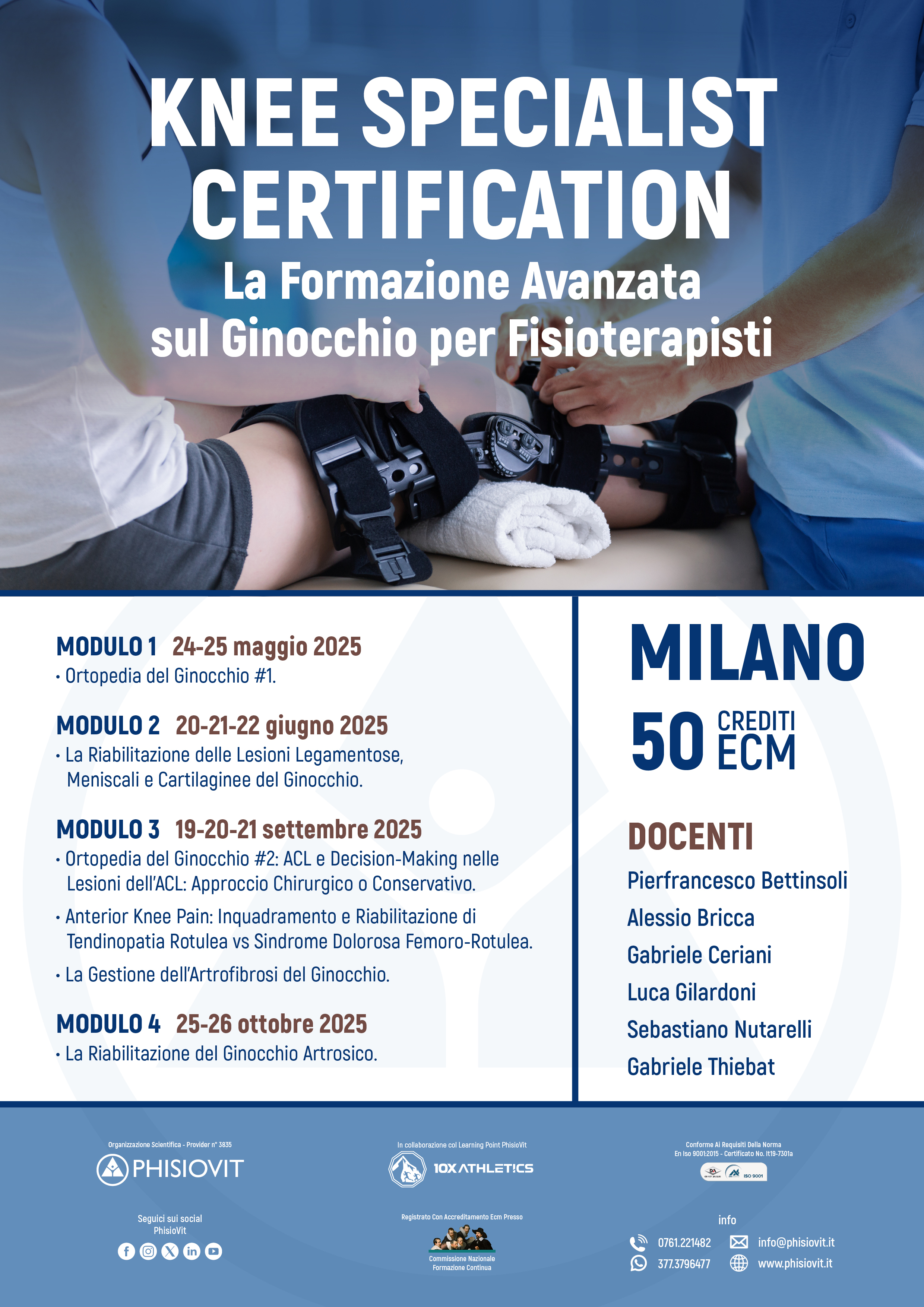 Il corso, della durata di dieci giorni residenziali non consecutivi (20-21 settembre, 24-25-26 ottobre, 14-15-16 novembre e 20-21 dicembre 2025 Knee Specialist Certification - La Formazione Avanzata sul Ginocchio per Fisioterapisti) riconosce la responsabilità scientifica nel Dott. Sebastiano Nutarelli, PhD student, MS Biomechanics, Sports PT, Clinical Researcher. Di seguito è possibile consultare il programma delle lezioni e il corpo docente: