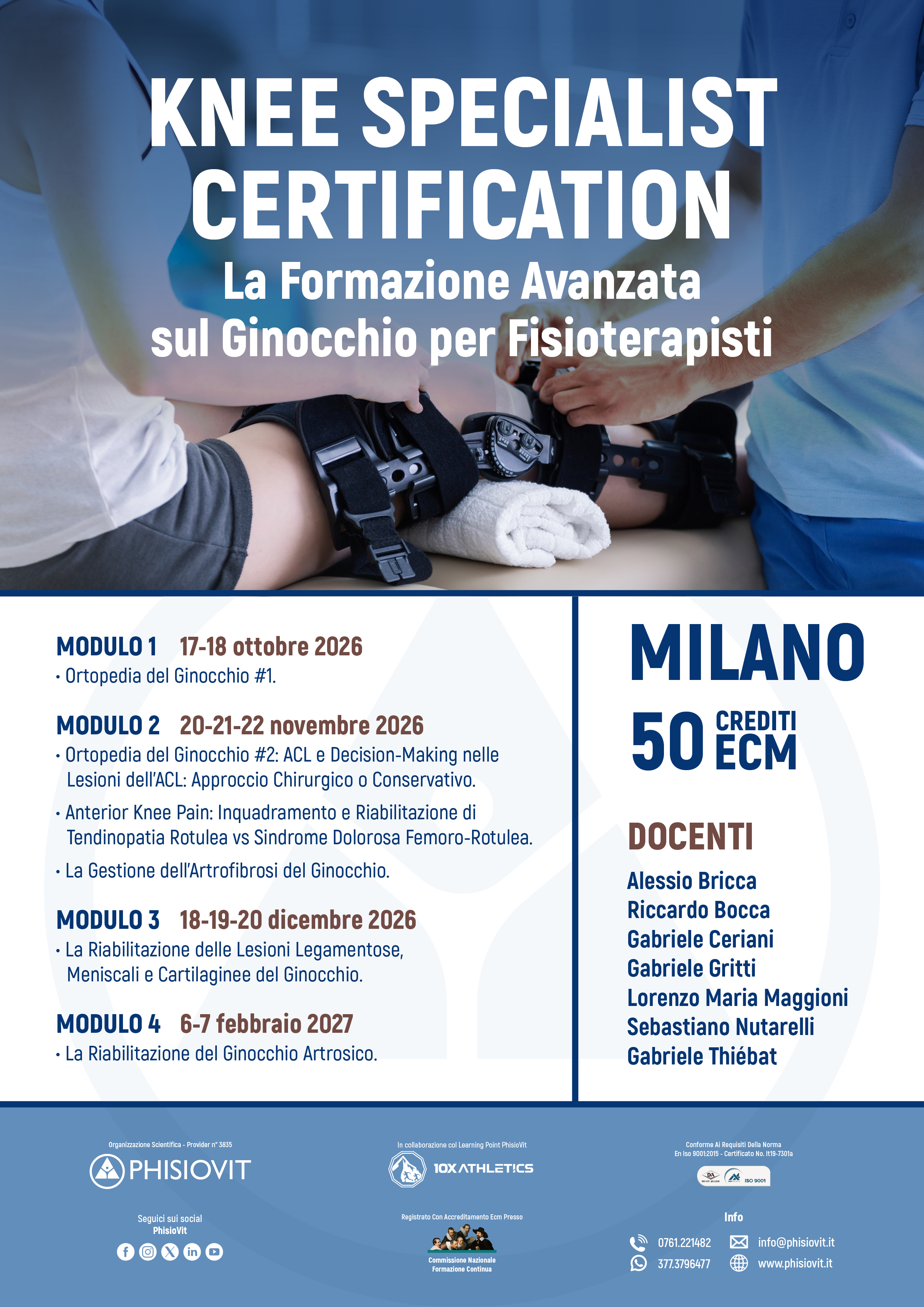 Il percorso formativo Knee Specialist Certification - La Formazione Avanzata sul Ginocchio per Fisioterapisti, della durata di dieci giorni residenziali non consecutivi (17-18 ottobre, 20-21-22 novembre, 18-19-20 dicembre 2026 e 6-7 febbraio 2027) riconosce la responsabilità scientifica nel Dott. Sebastiano Nutarelli, PhD student, MS Biomechanics, Sports PT, Clinical Researcher. Di seguito è possibile consultare il programma delle lezioni e il corpo docente: