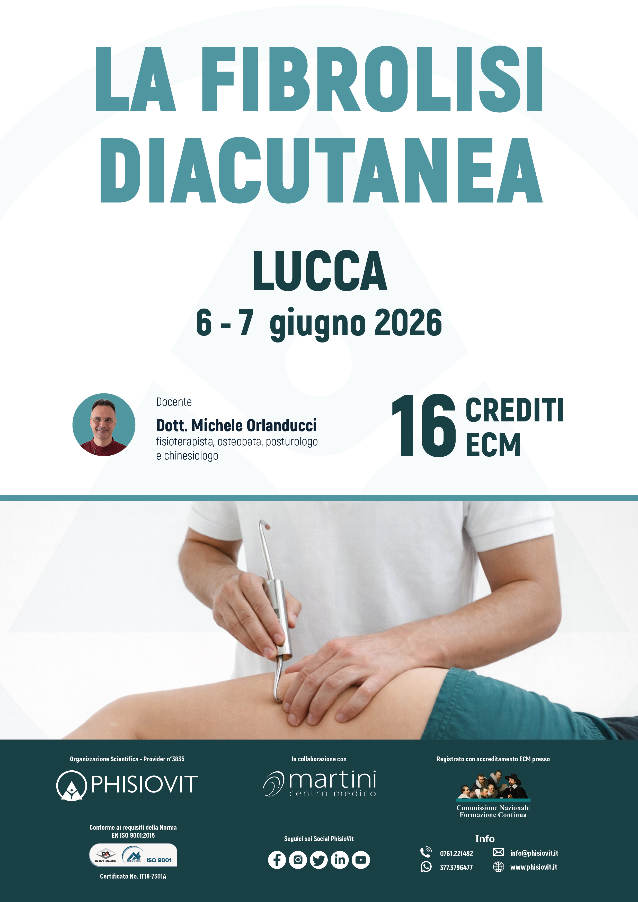 Il corso La Fibrolisi Diacutanea, della durata di due giornate in presenza, è rivolto a medici e fisioterapisti interessati ad acquisire competenze specifiche nella fibrolisi funzionale applicata all'apparato muscoloscheletrico. Il percorso formativo è strutturato per integrare costantemente teoria e pratica, alternando lezioni frontali sui principi, evoluzione e indicazioni della metodica a dimostrazioni e sessioni pratiche guidate, con un forte orientamento alla trasferibilità clinica. La progressione didattica si sviluppa in modo coerente e funzionale: