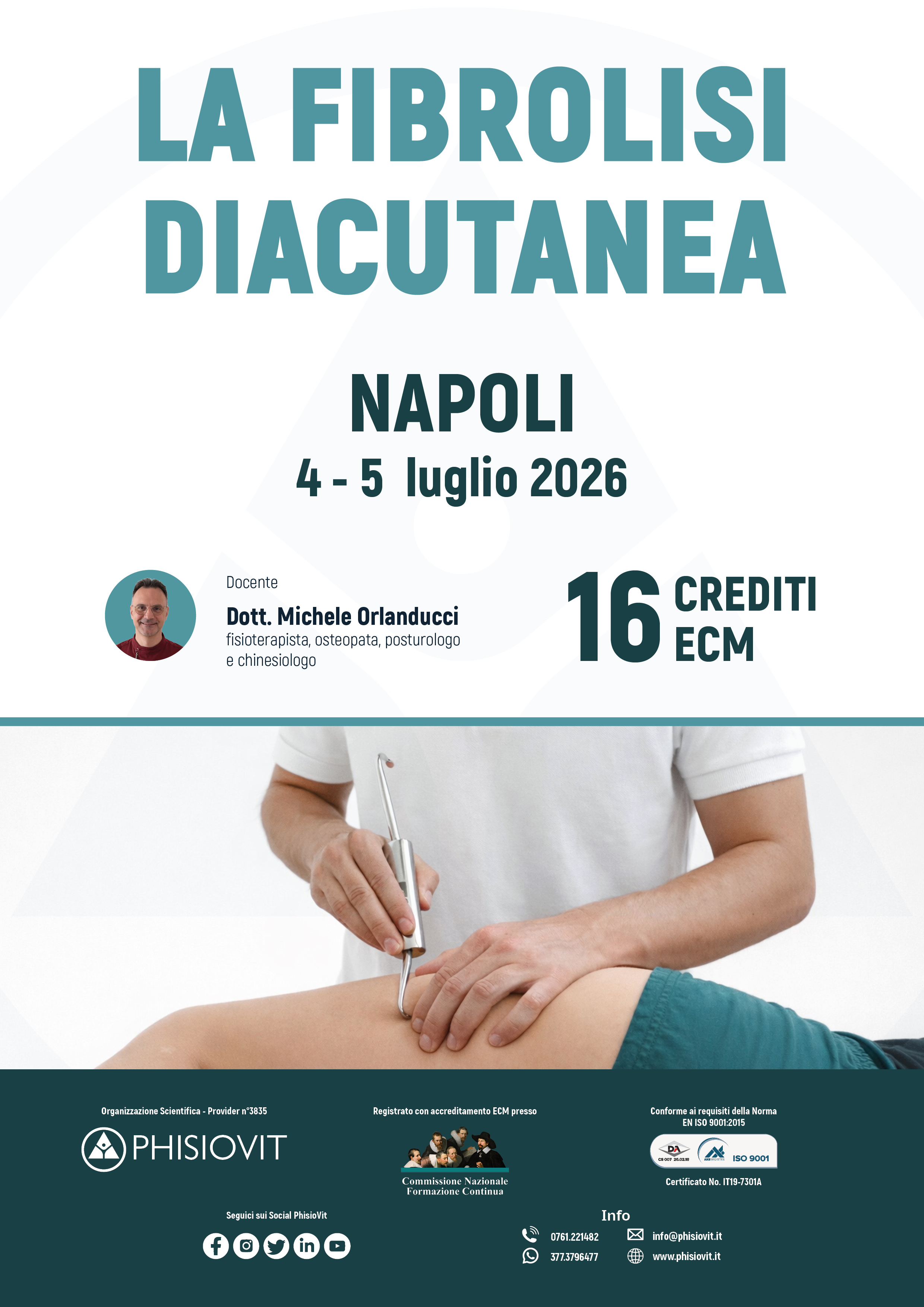 Il corso La Fibrolisi Diacutanea, della durata di due giornate in presenza, è rivolto a medici e fisioterapisti interessati ad acquisire competenze specifiche nella fibrolisi funzionale applicata all'apparato muscoloscheletrico. Il percorso formativo è strutturato per integrare costantemente teoria e pratica, alternando lezioni frontali sui principi, evoluzione e indicazioni della metodica a dimostrazioni e sessioni pratiche guidate, con un forte orientamento alla trasferibilità clinica. La progressione didattica si sviluppa in modo coerente e funzionale: