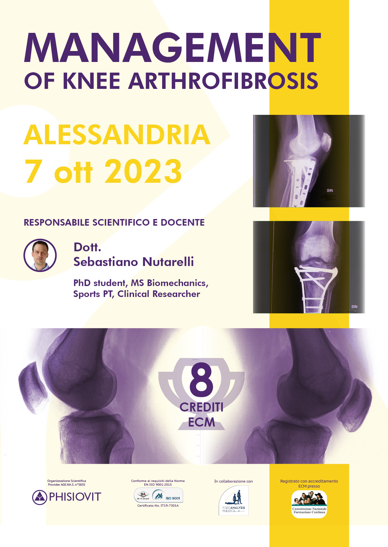 Il corso affronta tutte queste tematiche fornendo schemi riabilitativi ai partecipanti a seconda dei vari casi. Il docente è specializzato nella gestione di questa complessa patologia del ginocchio che è purtroppo potenzialmente devastante: da oltre quindici anni si è dedicato alla KAF, patologia spesso non diagnosticata, frequentando le sale operatorie e i dipartimenti di riabilitazione delle migliori cliniche ortopediche e di medicina sportiva negli Stati Uniti, come la Steadman Clinic (Vail, CO), il Cincinnati Sports Medicine & Orthopaedic Center/Dr. Noyes Knee Clinic (Cincinnati, OH), l'Andrew's Institute (Gulf Breeze, FL) e alcuni altri, sviluppando una comprensione approfondita dei meccanismi, delle cause, delle complicanze e degli approcci riabilitativi con maggiori chance di successo. Egli collabora inoltre con il sito web KNEEguru.co.uk per aiutare i pazienti affetti da artrofibrosi al ginocchio provenienti da tutta Europa. La multidisciplinarietà è cruciale in questo complicato processo, per questo motivo il docente lavora a stretto contatto con un team di chirurghi ortopedici del ginocchio in Svizzera, dove ha creato un centro di alta specializzazione per il trattamento della KAF che riceve pazienti anche dall'estero, nonché con alcuni specialisti negli USA per gestire al meglio ogni caso di KAF.