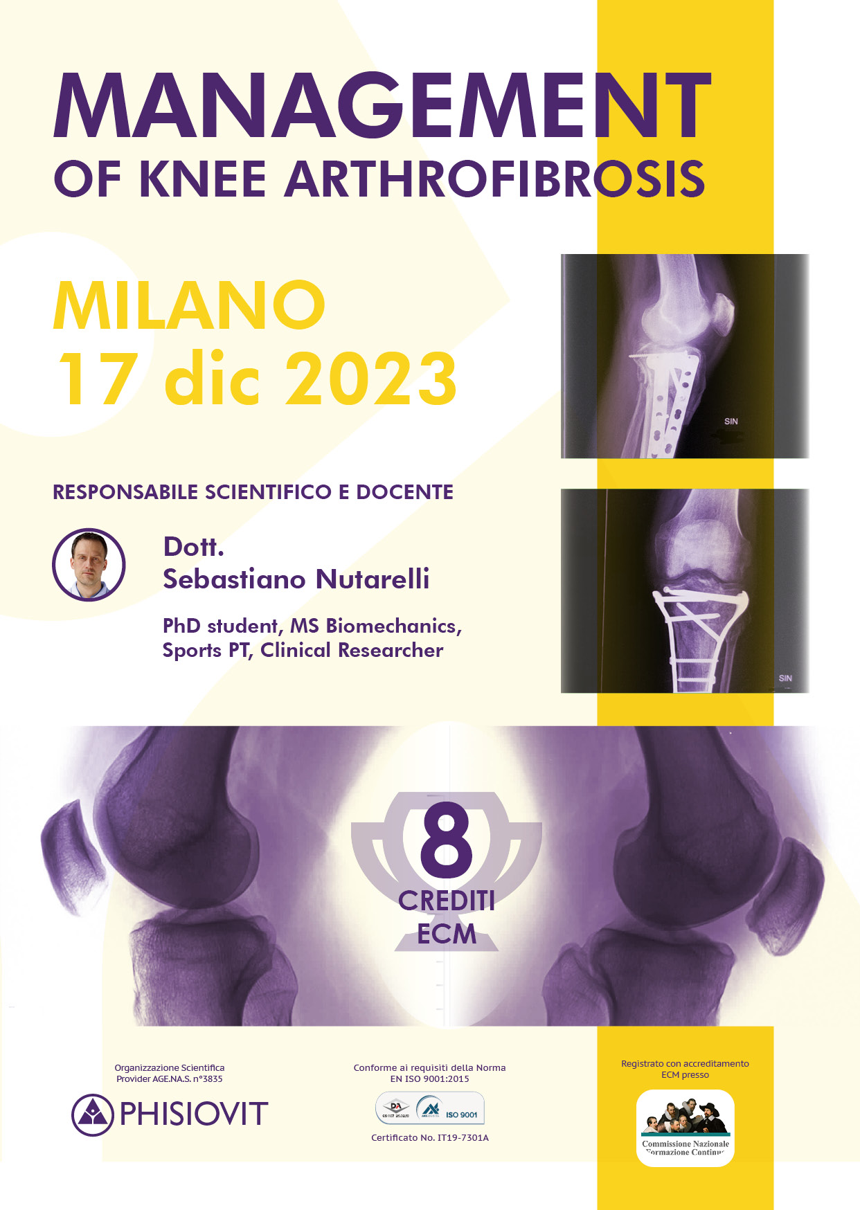 Il corso affronta tutte queste tematiche fornendo schemi riabilitativi ai partecipanti a seconda dei vari casi. Il docente è specializzato nella gestione di questa complessa patologia del ginocchio che è purtroppo potenzialmente devastante: da oltre quindici anni si è dedicato alla KAF, patologia spesso non diagnosticata, frequentando le sale operatorie e i dipartimenti di riabilitazione delle migliori cliniche ortopediche e di medicina sportiva negli Stati Uniti, come la Steadman Clinic (Vail, CO), il Cincinnati Sports Medicine & Orthopaedic Center/Dr. Noyes Knee Clinic (Cincinnati, OH), l'Andrew's Institute (Gulf Breeze, FL) e alcuni altri, sviluppando una comprensione approfondita dei meccanismi, delle cause, delle complicanze e degli approcci riabilitativi con maggiori chance di successo. Egli collabora inoltre con il sito web KNEEguru.co.uk per aiutare i pazienti affetti da artrofibrosi al ginocchio provenienti da tutta Europa. La multidisciplinarietà è cruciale in questo complicato processo, per questo motivo il docente lavora a stretto contatto con un team di chirurghi ortopedici del ginocchio in Svizzera, dove ha creato un centro di alta specializzazione per il trattamento della KAF che riceve pazienti anche dall'estero, nonché con alcuni specialisti negli USA per gestire al meglio ogni caso di KAF.