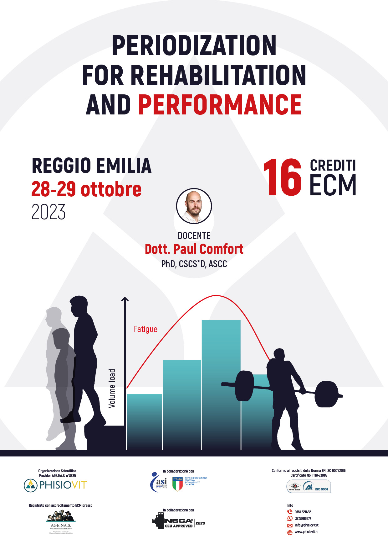 Il corso Periodization for Rehabilitation and Performance è composto da due giornate, per un totale di 16 crediti ECM. La prima giornata include la revisione dei concetti che sono alla base del training di Strength and Conditioning, compresi i razionali evidence-based per l'uso di diverse modalità di allenamento per ottenere specifiche risposte adattive. I concetti teorici alla base della periodizzazione dell'allenamento vengono esplorati in dettaglio, con la discussione sull'identificazione e il monitoraggio delle specifiche priorità di allenamento, sia che l'individuo sia infortunato o perfettamente in forma. La teoria viene supportata da studi di casi condotti dagli studenti, per garantire un'appropriata applicazione della teoria alla pratica. Ciò dovrebbe lasciare i partecipanti in una posizione in cui possono applicare con competenza i principi di periodizzazione ai loro programmi di riabilitazione. Per garantire che questi principi possono essere applicati a una vasta gamma di popolazioni, vengono forniti scenari e riferimenti specifici a una varietà di casi studio. Nello specifico sarà trattato quanto segue: