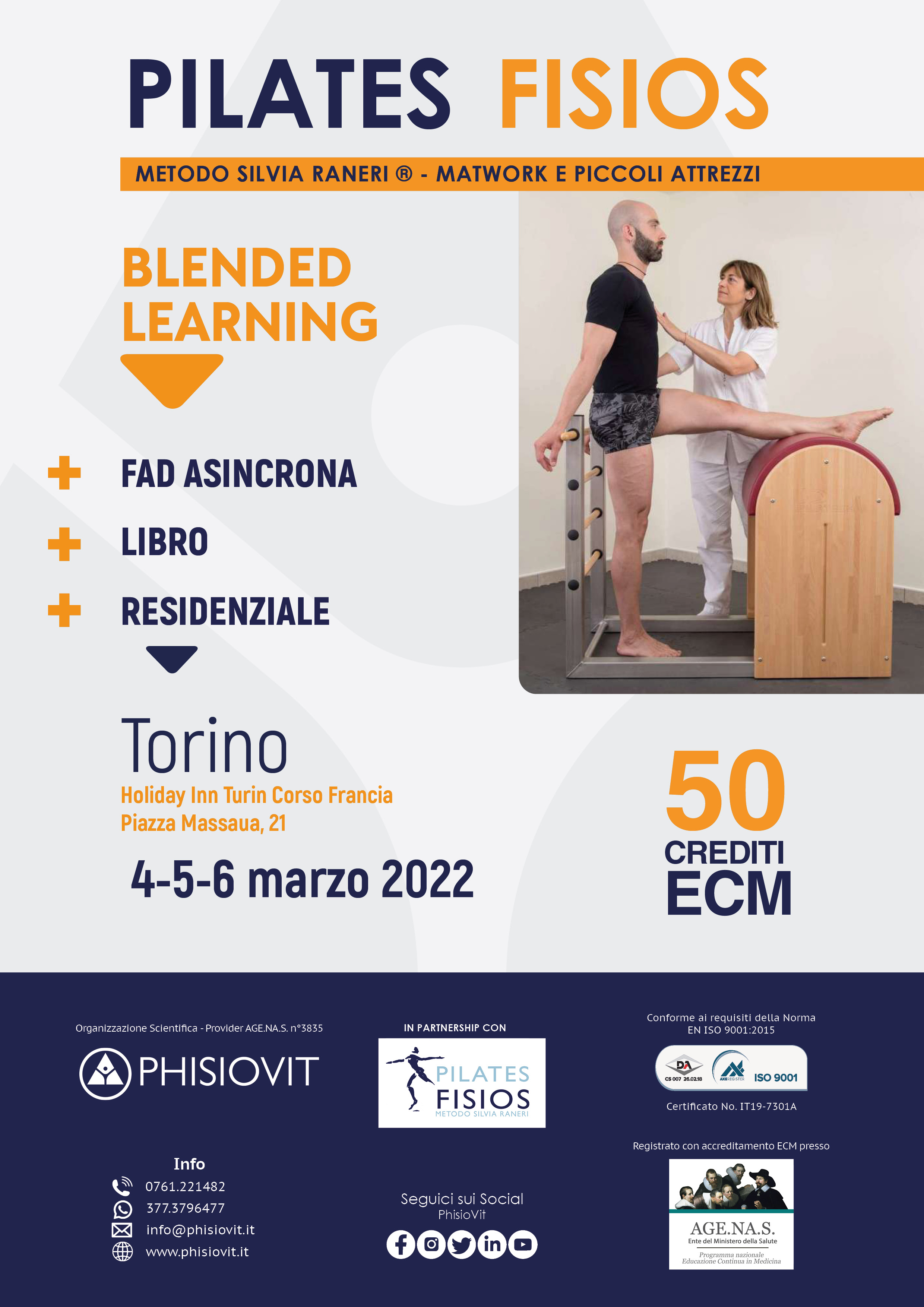 - STEP 2 RESIDENZIALE IN AULA - Il corso in presenza, strettamente pratico, successivo alla FAD asincrona e della durata di tre giorni consecutivi (4-5-6 marzo 2022 "L'evoluzione del Pilates in ambito riabilitativo: Pilates Fisios metodo Silvia Raneri® matwork base, intermedio, avanzato e piccoli attrezzi"), è condotto dalla Dott.ssa Silvia Maria Raneri, fisioterapista e ideatrice del metodo Pilates Fisios, secondo il seguente programma: