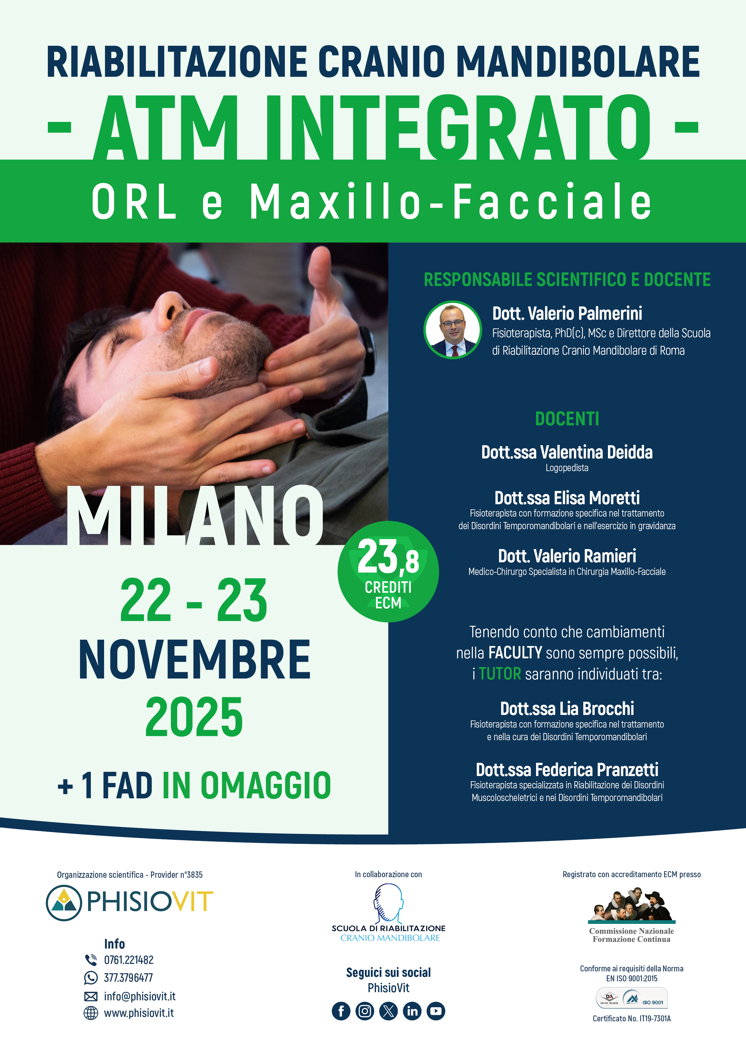 I vari livelli della scuola di riabilitazione cranio mandibolare offrono piani formativi completi per professionisti sanitari sui disordini temporomandibolari, dolore orofacciale e loro riabilitazione multidisciplinare, permettendo al discente una crescita ampia, graduale e accurata. La mattina del primo giorno del corso integrato ORL e maxillo-facciale viene dedicata a introdurre al meglio il partecipante a riconoscere i più diffusi splint occlusali utilizzati per la terapia dei disordini cranio mandibolari. Viene analizzato il ruolo del palato attraverso l'illustrazione di alcune tecniche di terapia manuale dedicate a questo sensibile distretto della bocca. Nel pomeriggio, sono approfonditi segni e sintomi della sfera otorinolaringoiatrica nei pazienti con disordine temporomandibolare, attraverso esercizi terapeutici e valutativi semplici, pratici ed efficaci. Dalle componenti della crescita facciale, alle relazioni dell'ATM con osso ioide e a come funzionano la voce o la deglutizione, viene offerta un'ampia e sempre descritta in letteratura antologia di tecniche terapeutiche miofunzionali. La giornata si conclude con un approfondimento sui tinnitus, in particolare su quelli di sottotipo somatosensoriale e temporomandibolare, a come riconoscerli e all'approccio riabilitativo. Nella mattinata del secondo giorno, vengono illustrate le tecniche di chirurgia maxillo-facciale di più frequente riscontro clinico in ambito cranio mandibolare. Il partecipante può così ampliare le sue conoscenze in materia di chirurgia maxillo-facciale traumatica, oncologica e ortognatica. Può inoltre apprendere i protocolli riabilitativi e le tecniche previste in ciascuna situazione. Il pomeriggio si conclude con un approfondimento sul nervo faciale e sulle problematiche che possono comportarne paralisi: vengono introdotte tecniche riabilitative più classiche ma anche più innovative, come ad esempio l'utilizzo delle emozioni per un più veloce recupero e una migliore ripresa.