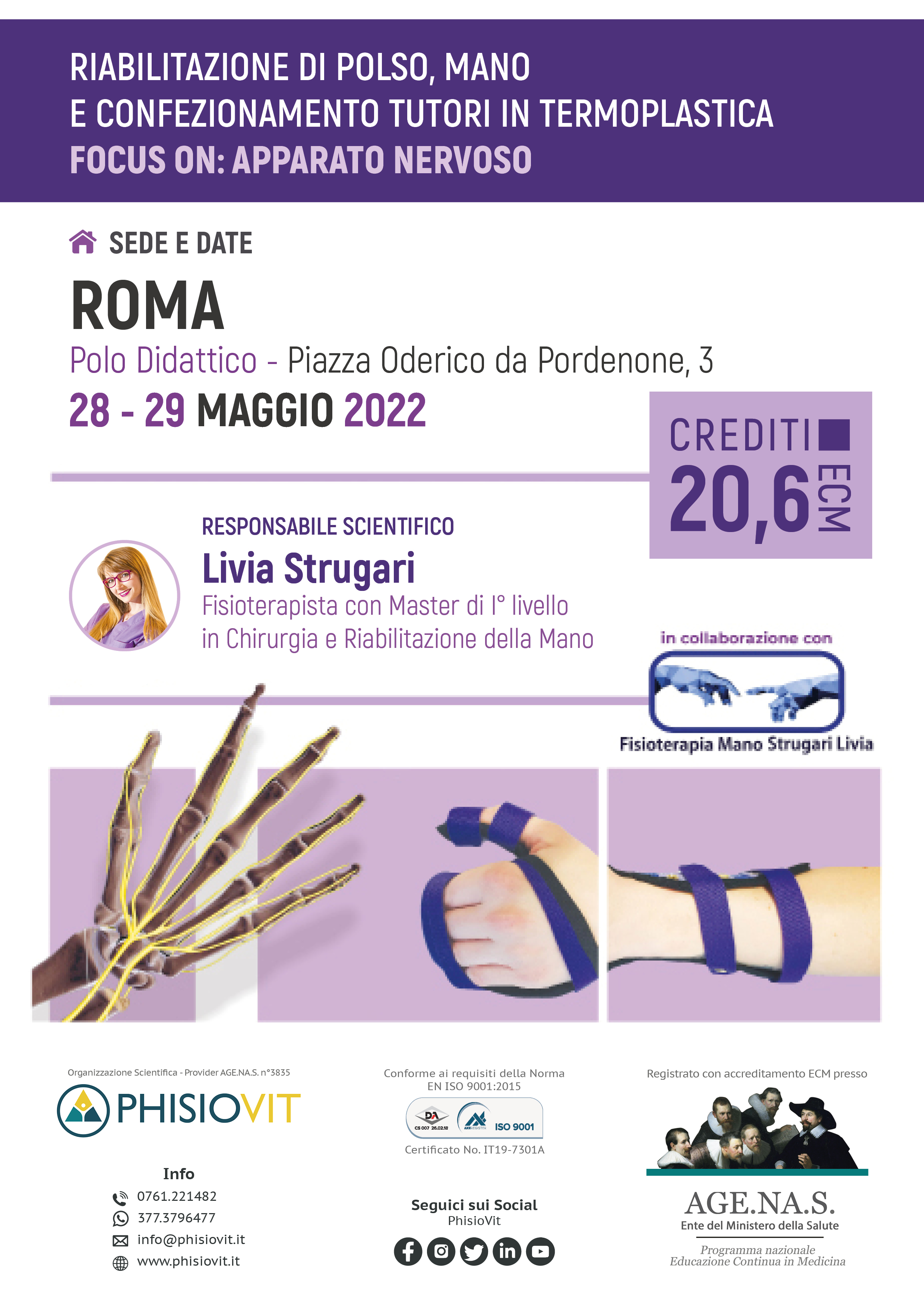 Questo corso, specifico sulla riabilitazione di polso e mano, è stato accuratamente progettato con il preciso fine di istruire i professionisti dell'area riabilitativa sul trattamento conservativo delle patologie compressive dei nervi. La riabilitazione deve essere mirata e tempestiva, al fine di evitare che una condizione normalmente solo temporanea e risolvibile, non evolva in un danno progressivo, persistente ed irreparabile. L'utilizzo di un tutore fatto su misura è una soluzione che permette, immobilizzando le articolazioni a monte e a valle della compressione, di ridurre la componente articolare di costrizione, lasciando il nervo più libero e decompresso nel tempo in cui il tutore viene indossato. A tale trattamento viene associato un percorso di terapia occupazionale e di riabilitazione: quest'ultima prevede tecniche specifiche che attingono da discipline come la terapia manuale, la neurodinamica, le tecniche di mobilizzazione etc. partendo dallo studio anatomico e biomeccanico della mano. Ampio respiro nella didattica viene dato inoltre alla nota sindrome dolorosa regionale complessa (algoneurodistrofia), sindrome di grande interesse in questo ambito.