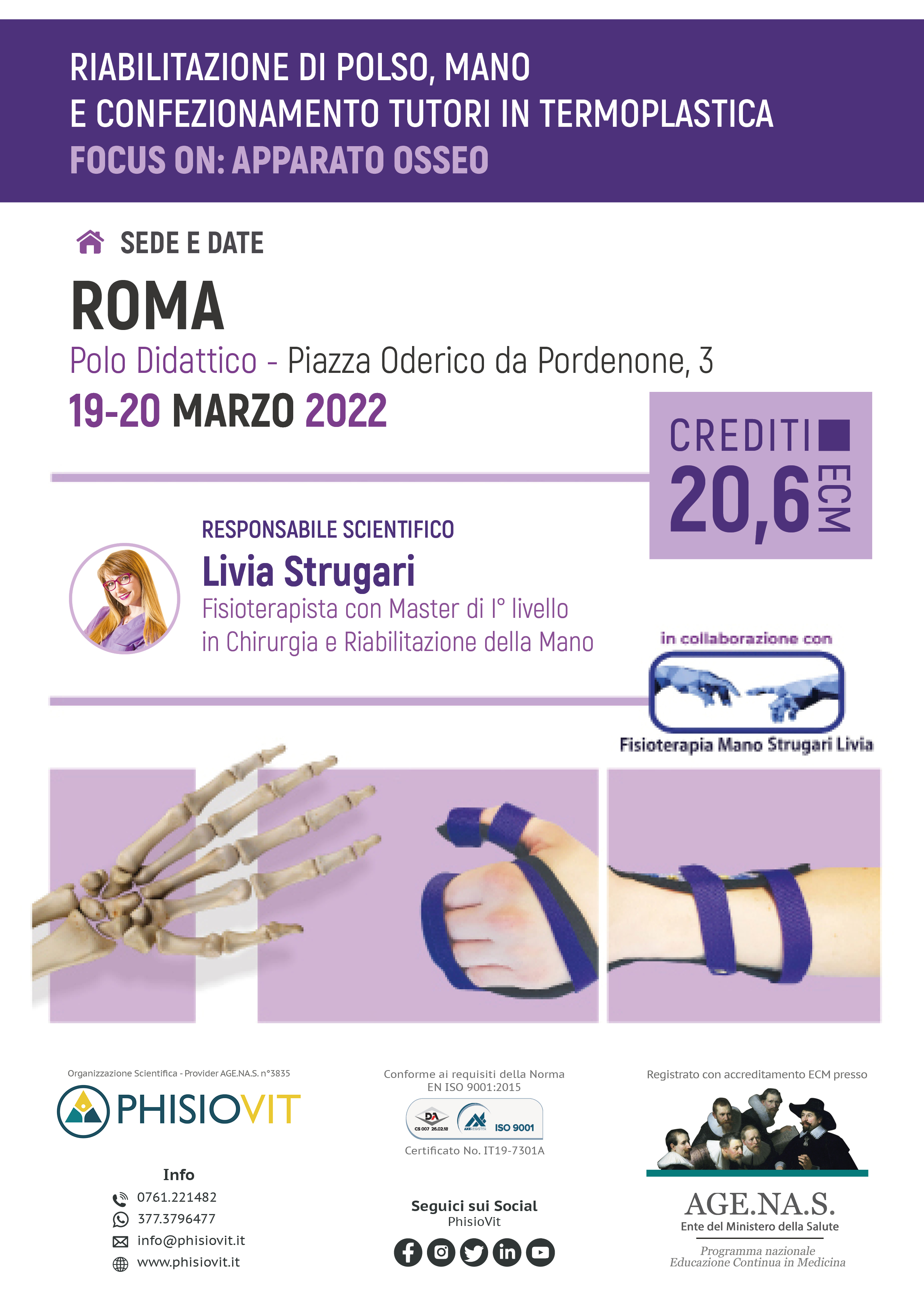 Questo evento si propone di fornire un panorama dei trattamenti fisioterapici, riabilitativi e conservativi delle patologie ossee della mano, a cui segue una parte pratica di laboratorio, dove ogni singolo partecipante apprende non solo gli esercizi e le più comuni tecniche riabilitative ma anche l'arte del confezionamento dei tutori. I contenuti del corso comprendono nozioni di anatomia, la conoscenza dei meccanismi patogenetici delle patologie ossee più frequenti della mano, le procedure di valutazione, le metodiche di trattamento mediante tecniche manuali, splinting, autotrattamento, terapia occupazionale, taping, coban ed esercizio terapeutico.