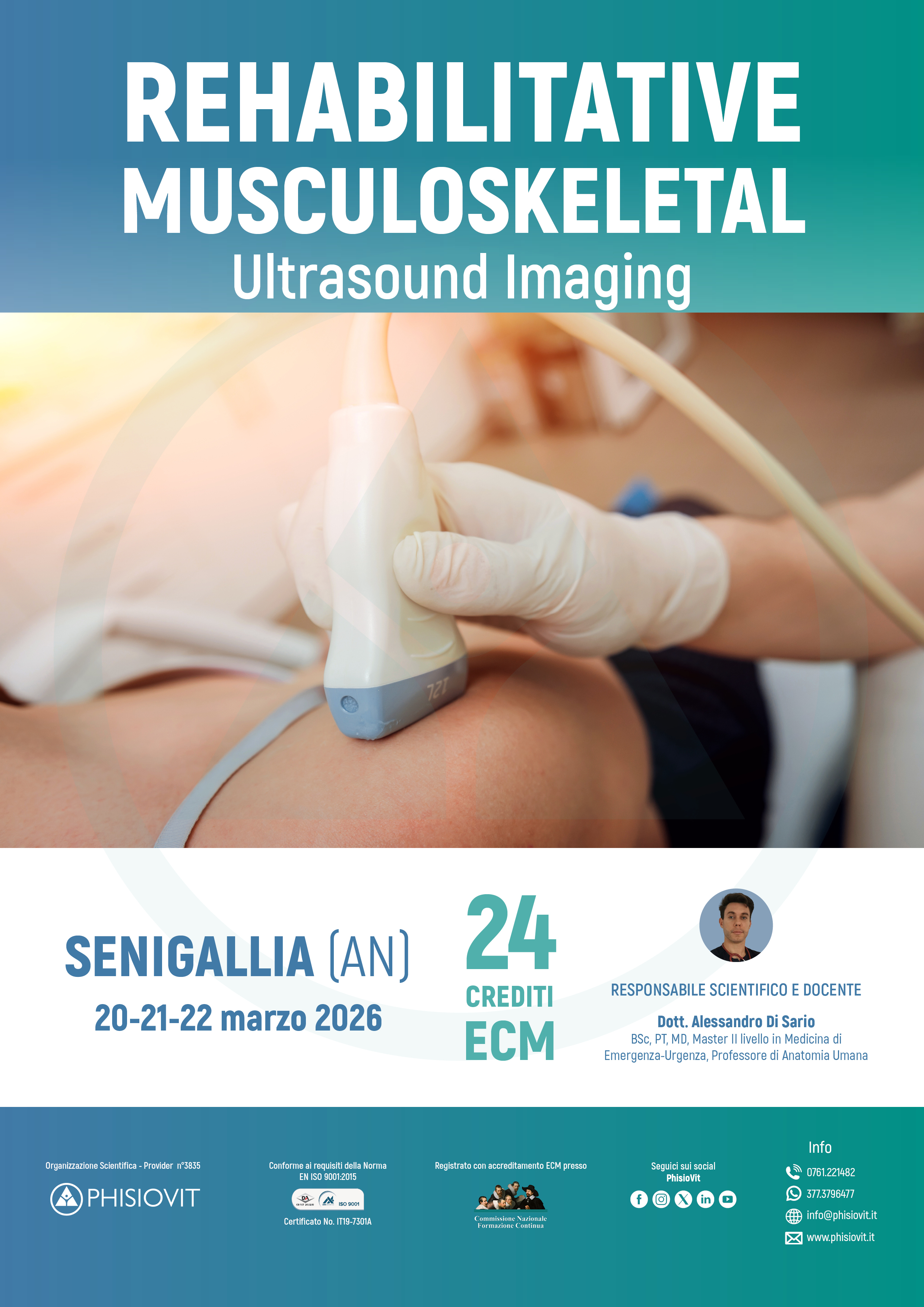 Rehabilitative Musculoskeletal Ultrasound Imaging è un corso innovativo rivolto a fisioterapisti e professionisti della riabilitazione che desiderano integrare l'ecografia muscoloscheletrica nella pratica clinica quotidiana. L'evoluzione della figura del fisioterapista, sempre più orientata all'evidenza scientifica, richiede strumenti affidabili e specifici per ottimizzare la valutazione clinica e personalizzare i trattamenti. Il corso offre un approccio pratico e interattivo all'uso dell'ecografia muscoloscheletrica per l'analisi delle strutture osteo-articolari e muscolo-tendinee degli arti superiori e inferiori. I partecipanti avranno l'opportunità di apprendere in un contesto altamente operativo, alternandosi nei ruoli di operatori e pazienti, con sessioni pratiche dedicate a spalla, gomito, polso, anca, ginocchio e caviglia. L'ecografia, grazie alla sua capacità di fornire immagini di alta risoluzione in tempo reale, rappresenta un valore aggiunto significativo nella pratica riabilitativa, migliorando l'accuratezza delle valutazioni, il monitoraggio dei progressi terapeutici e la comunicazione con i pazienti. Il programma include anche sessioni specifiche dedicate allo screening per referral, ovvero all'identificazione di segni e sintomi che potrebbero indicare patologie non muscoloscheletriche o condizioni che richiedono un approfondimento medico specialistico. Particolare attenzione sarà riservata al riconoscimento dei segni ecografici di sospetto in caso di trombosi venosa profonda (TVP), al fine di fornire ai partecipanti le competenze necessarie per individuare precocemente tali condizioni e garantire un tempestivo invio a valutazione specialistica. Questo approccio è fondamentale per migliorare l'appropriatezza dell'intervento riabilitativo, evitare ritardi diagnostici, garantire la sicurezza del paziente e aumentare l'efficacia del percorso terapeutico. Verranno illustrate le principali condizioni patologiche, i segni ecografici di sospetto e le competenze per riconoscere precocemente situazioni cliniche critiche. Il corso non ha l'obiettivo di formare i partecipanti alla diagnosi medica, ma di fornire strumenti per integrare efficacemente l'ecografia nella valutazione funzionale e riabilitativa, in stretta collaborazione con il team medico.
