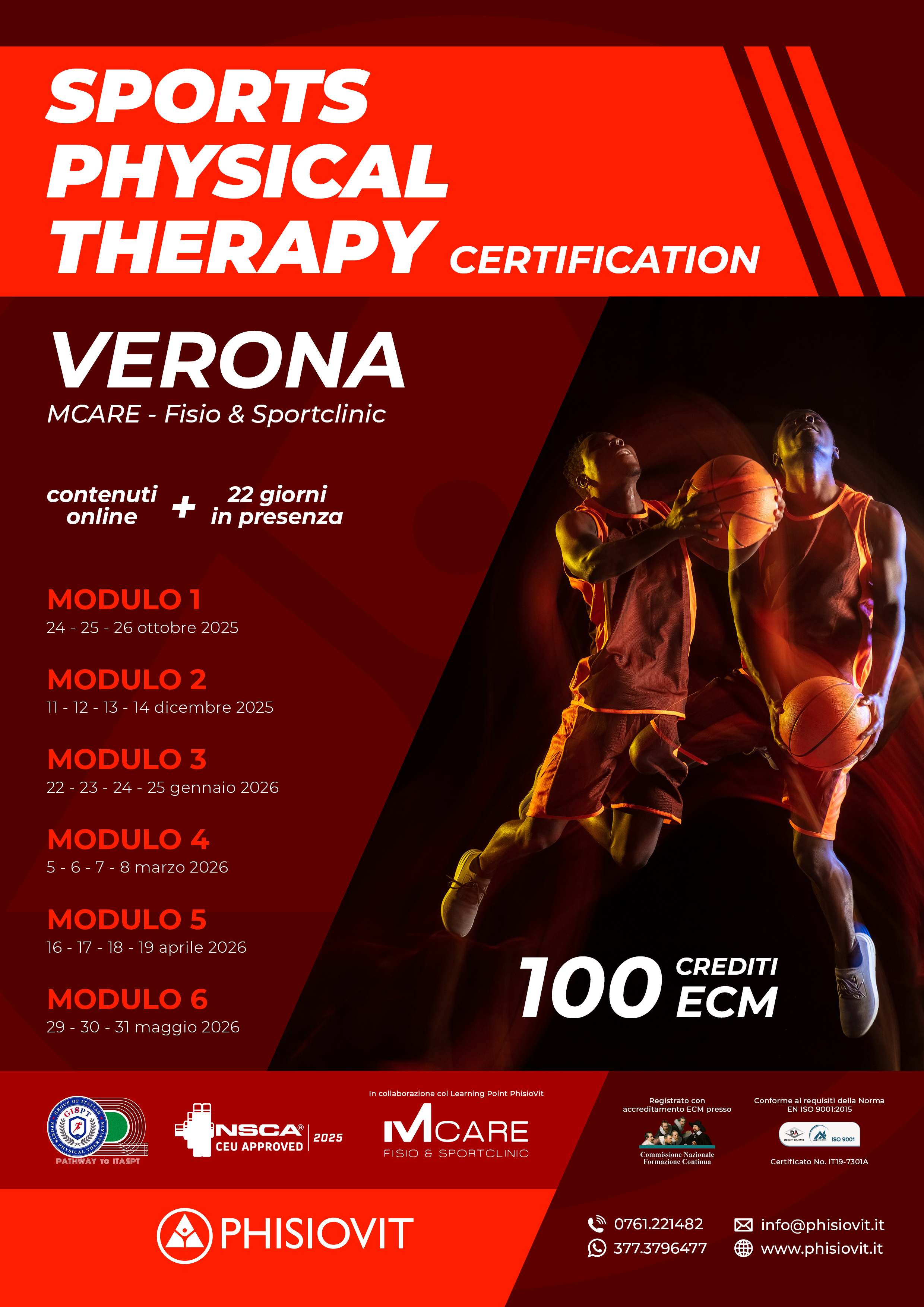 Il percorso formativo Sports Physical Therapy Certification è stato strutturato in collaborazione con un panel di alcuni tra i più quotati professionisti internazionali al fine di garantire una proposta formativa completa nell'ambito della fisioterapia sportiva. L'ampio gruppo dei docenti è costituito da fisioterapisti, medici e preparatori atletici di fama internazionale in campo sportivo professionistico, coordinatori di team riabilitativi o di performance di squadre che militano nei massimi campionati europei, selezioni olimpiche/nazionali, e coordinatori di noti centri di riabilitazione e performance, ricercatori clinici e accademici. Il percorso formativo si articola lungo un programma composto da sei moduli della durata complessiva di ventidue giornate in presenza, più alcuni moduli online. I contenuti didattici, teorici e pratici, sono stati definiti in considerazione delle più recenti evidenze cliniche emerse dalla letteratura scientifica nell'ambito della sports medicine, evidenze che verranno contestualizzate in un solido ragionamento clinico da applicare nei diversi scenari di prevenzione e riabilitazione dello sportivo. I singoli moduli sono stati sviluppati per aderire il più possibile alle 11 Core Competencies & Standards stabilite dall'International Federation of Sports Physical Therapy (IFSPT) al fine di favorire l'acquisizione delle competenze utili per registrarsi come ITA-SPT tramite il Gis Sport di AIFI, ovvero il gruppo di interesse specialistico in fisioterapia sportiva rappresentante l'IFSPT in Italia.