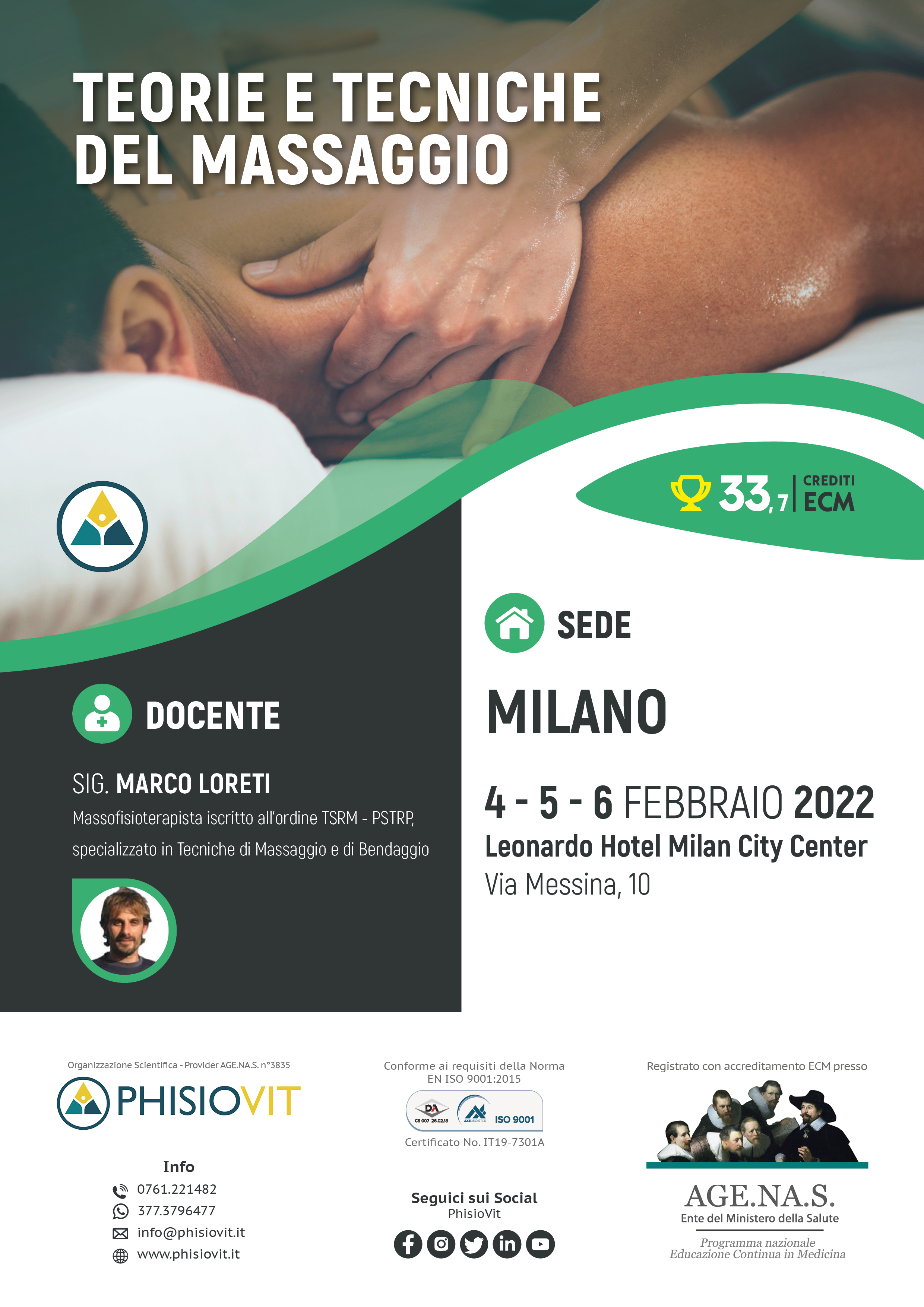 Il corso, della durata di tre giorni consecutivi (4-5-6 febbraio 2022 "Teorie e Tecniche del Massaggio"), è tenuto dal docente Marco Loreti, massofisioterapista iscritto all'ordine TSRM - PSTRP, specializzato in Tecniche di Massaggio e di Bendaggio. Gli orari, per tutti e tre i giorni, vanno dalle 9.00 alle 18.00 con due pause caffè di quindici minuti alle 11.00 e alle 16.00 e una pausa pranzo di un'ora alle 13.00.