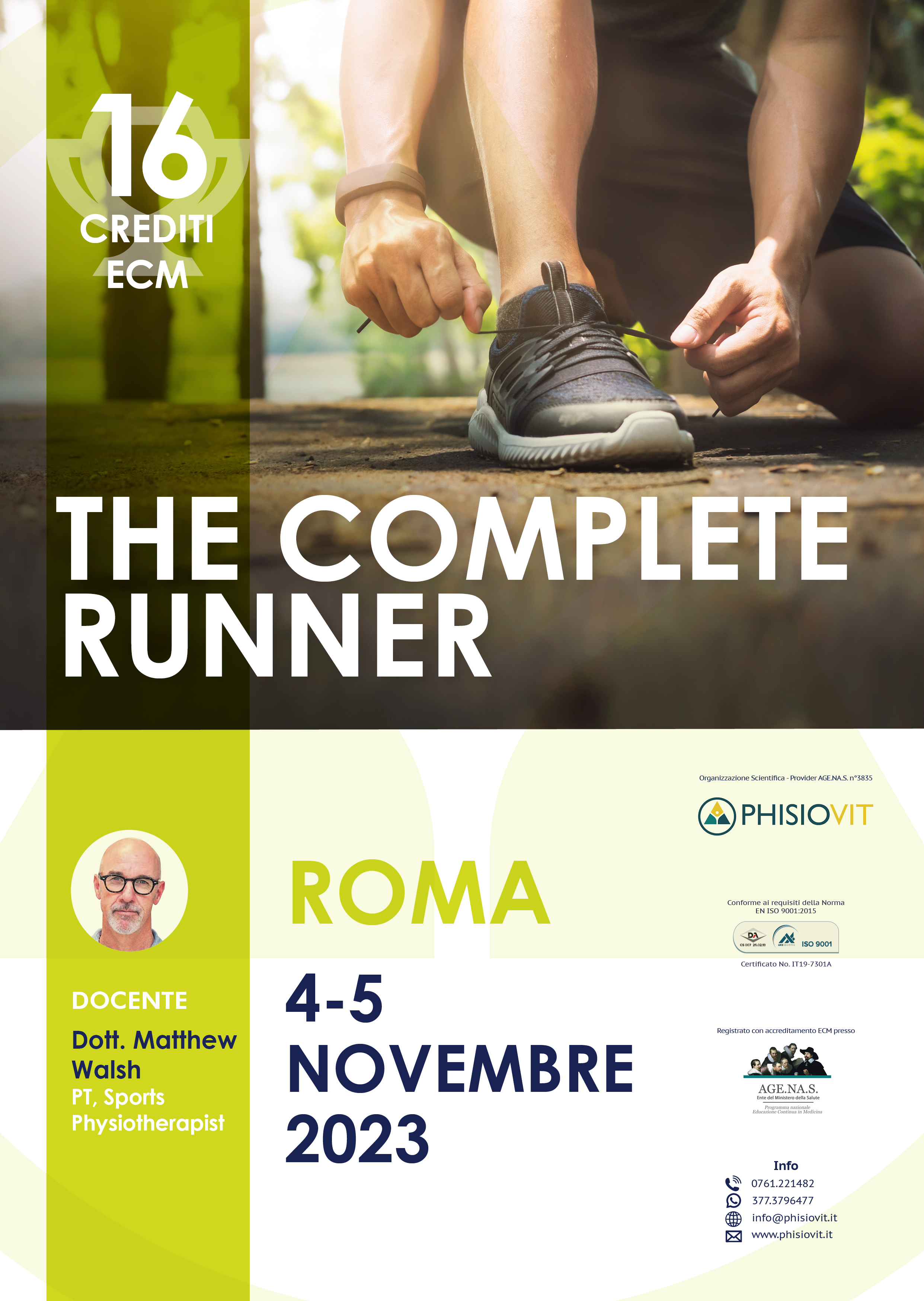 Ottimizzare le prestazioni di un corridore sano è molto impegnativo, riportare un paziente a correre nel proprio sport ottimizzando la meccanica e le strategie di allenamento aggiunge un altro livello di complessità all'equazione. Attraverso decenni di esperienza con la community della corsa, dai principianti ai professionisti, e oltre vent'anni d'insegnamento nei corsi di running a fisioterapisti e allenatori in tutto il mondo, Matthew Walsh offre un'incredibile opportunità ai partecipanti di questo evento grazie al trasferimento al pubblico delle competenze cliniche acquisite nel tempo. L'intento è così quello di fornire un'ampia gamma di informazioni dei diversi elementi necessari per valutare e trattare in modo completo i pazienti runner come ad esempio: