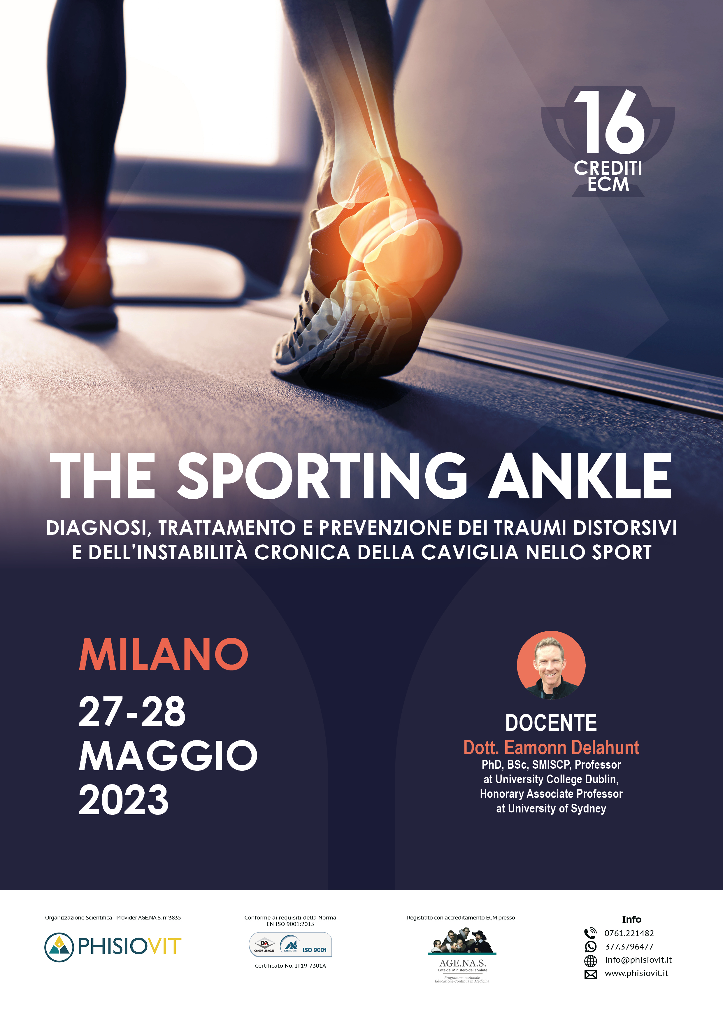 Considerando l'elevata prevalenza di distorsioni di caviglia in chi pratica sport di vario tipo, l'impegno nella formazione per l'implementazione di strategie riabilitative efficaci, basate su un'attenta diagnosi, nonché atte a ridurre il rischio di tali infortuni e delle complicanze associate, costituisce una priorità per i clinici. Il corso affronta tutte queste tematiche fornendo schemi riabilitativi ai partecipanti a seconda dei vari casi. Eamonn Delahunt, il docente incaricato, insegna presso la University College Dublin School of Publich Health ed è specializzato nella gestione di questa complessa patologia di caviglia. Mette a disposizione del partecipante una vasta esperienza di settore e nel suo corso offre questi argomenti principali: