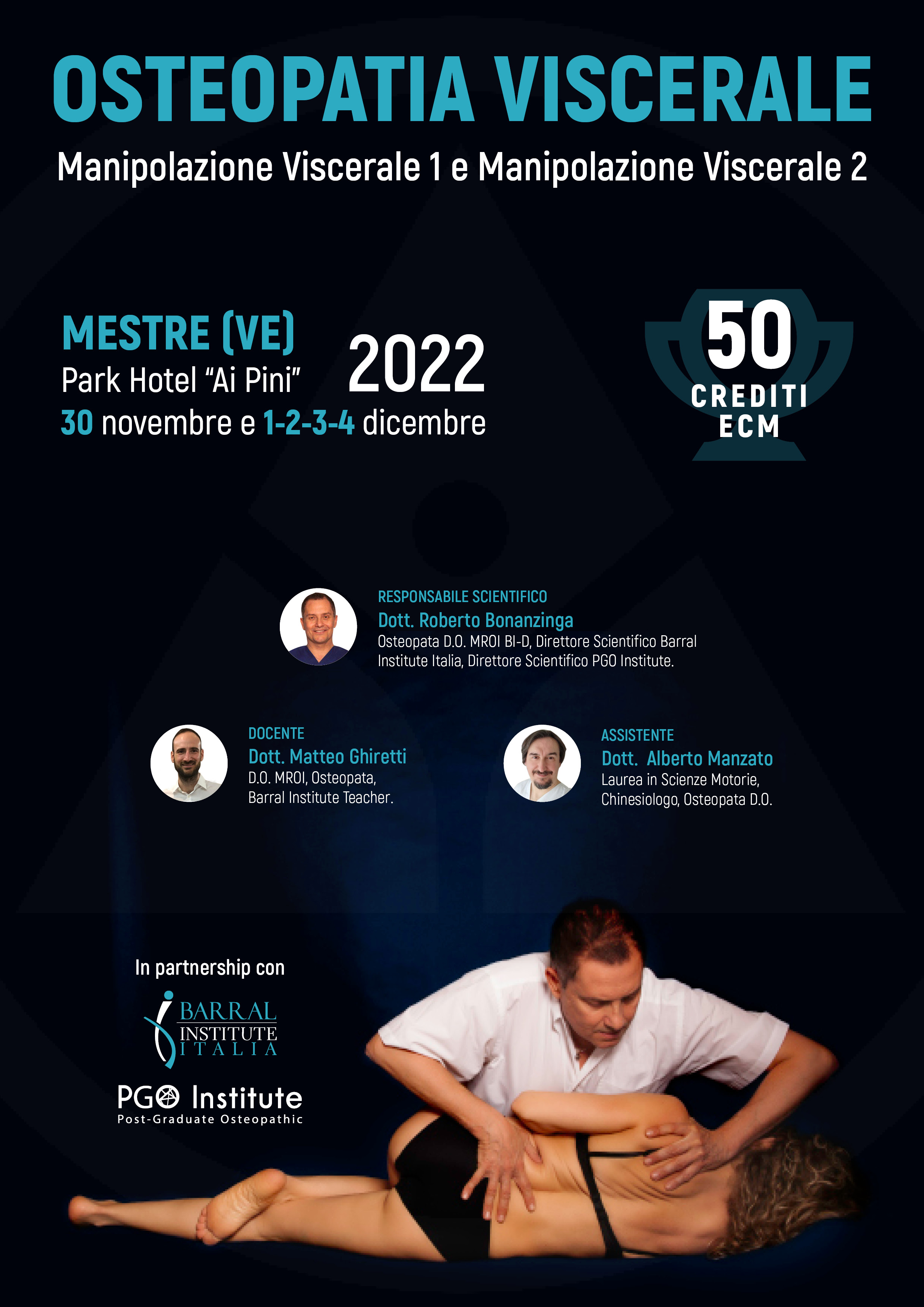 Al termine del corso il partecipante sarà in grado di eseguire un'appropriata valutazione del paziente e operare correzioni delle disfunzioni intra-retro peritoneali attraverso un trattamento preciso e mirato.