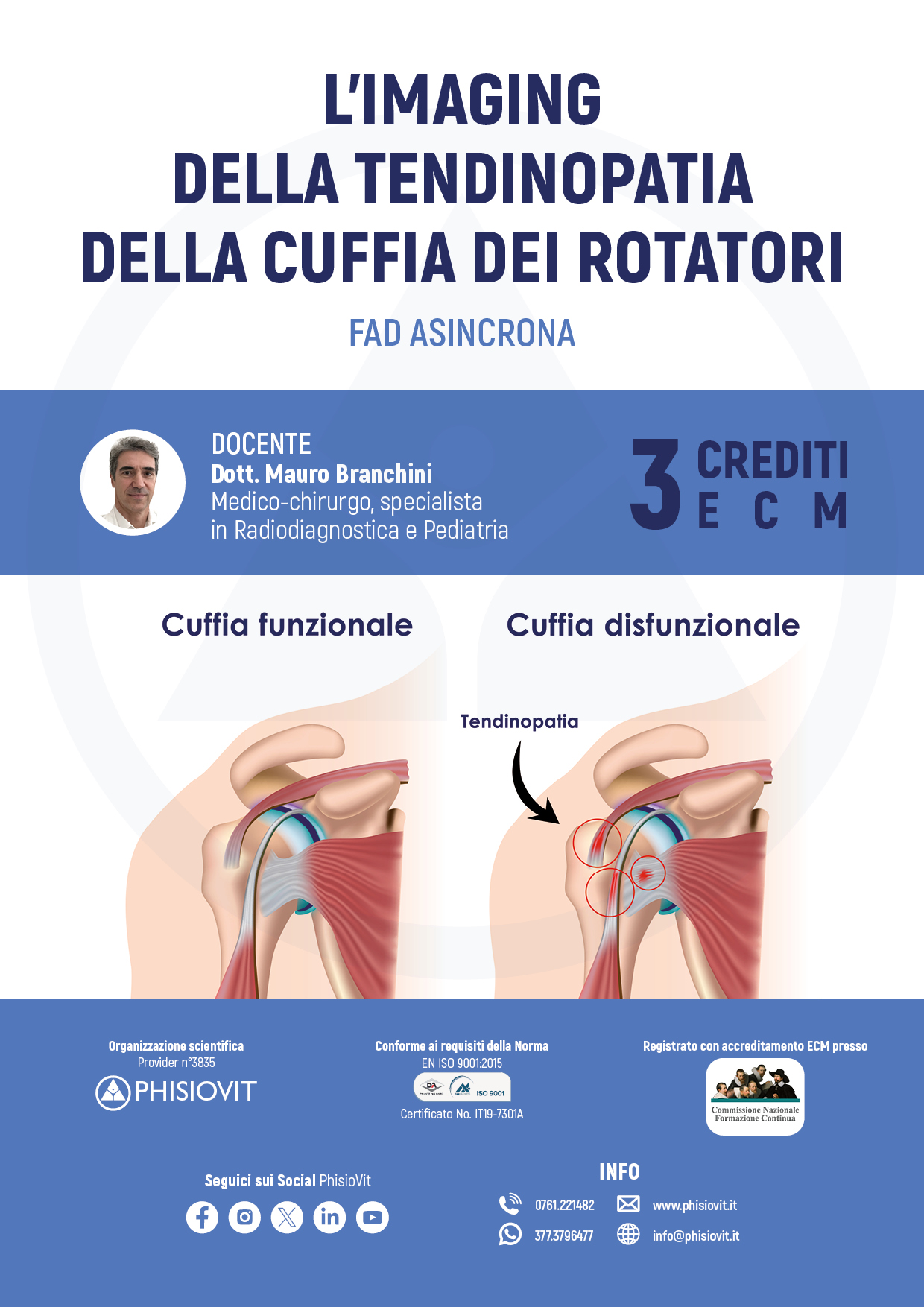 Questo corso è un prodotto didattico derivato da un Webinar registrato che l'autore ha sostenuto per il pubblico: la registrazione viene così messa a disposizione in questo corso per intero e in formato originale lasciando invariata l'interazione che c'è stata durante la diretta e che ha compreso lezioni, domande dell'uditorio, sondaggi sull'evento e dibattito finale. Slide, immagini di RX, RM, Ecografia e TC, tabelle, grafici e schede commentati dal docente interagendo con la platea hanno reso unico e aggiornato questo evento a distanza in aula virtuale. Il corso, come detto imperniato sulla diagnostica per immagini della tendinopatia della cuffia dei rotatori, prevede inizialmente un breve ripasso delle strutture anatomiche della spalla con il loro orientamento nello spazio e con la loro funzione, illustrando successivamente cosa le diverse tecniche di imaging radiologico sono in grado di visualizzare. Un'ampia sezione è dedicata alla Risonanza Magnetica (RM) con la descrizione delle diverse strutture visualizzate nei diversi piani di scansione e dei quadri normali e patologici.