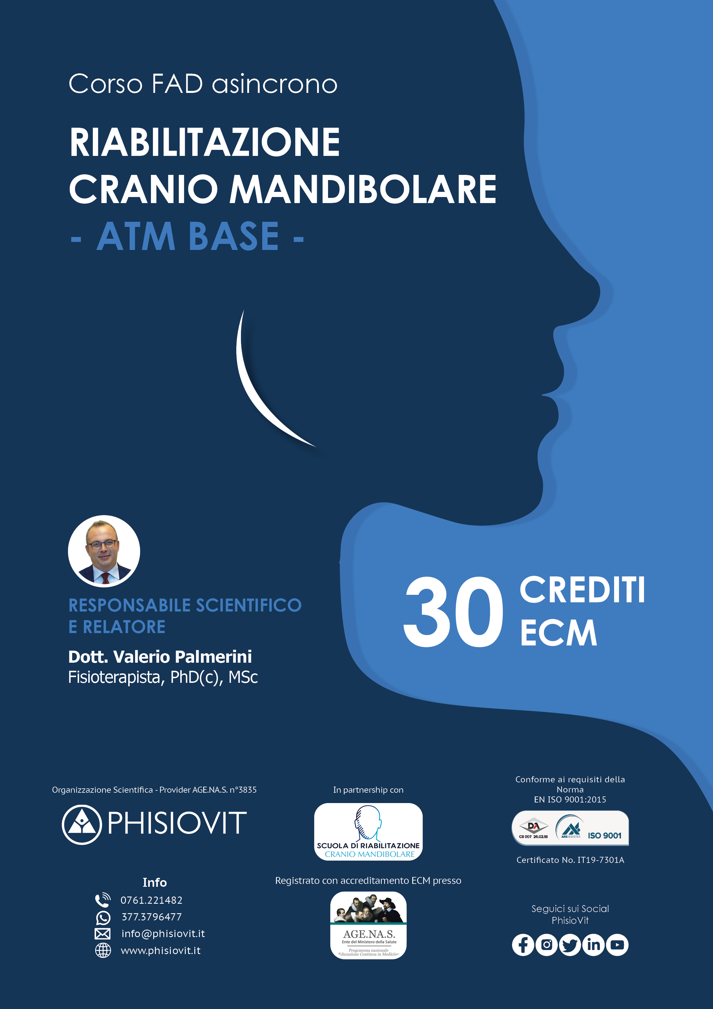 Questo corso FAD asincrono, dal titolo "Riabilitazione Cranio Mandibolare - ATM Base" è stato prodotto in collaborazione con la Scuola di Riabilitazione Cranio Mandibolare, uno tra i più accreditati istituti nazionali e internazionali ad offrire piani formativi completi per professionisti sanitari sui disordini temporomandibolari, dolore orofacciale e loro riabilitazione multidisciplinare, permettendo così al discente una crescita ampia, graduale ed accurata.