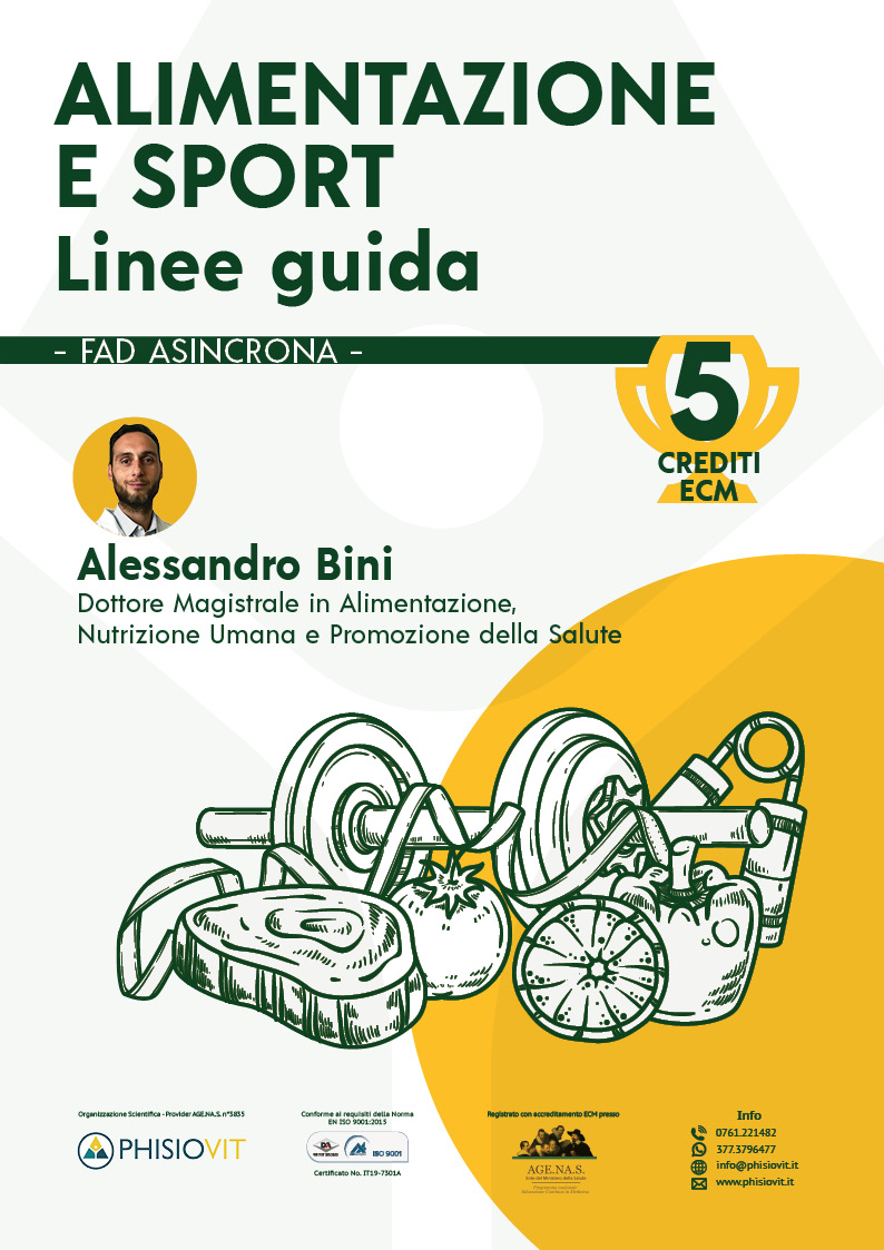 Il corso è strutturato per offrire una visione generale dell'alimentazione nell'ambito sportivo, andando ad analizzare i concetti fondamentali e le regole dietetiche della dieta mediterranea per capire cosa, quanto, quando, come e perché uno sportivo si deve alimentare correttamente per mantenere un buono stato di salute. Si descrivono il metabolismo aerobico e anaerobico per favorire la corretta assunzione di nutrienti, i substrati energetici usati nei diversi momenti dell'esercizio fisico e vengono approfondite le diverse intensità di esercizio rapportate alle fonti di energia disponibili per l'organismo. Si prendono in esame i principali nutrienti di cui un atleta necessita per svolgere l'esercizio fisico in vari momenti: periodo pre gara e allenamento, periodo di svolgimento della prestazione fisica e fase di recupero. In particolare si analizzano in maniera dettagliata le qualità nutrizionali, le funzioni metaboliche, i fabbisogni di carboidrati, proteine e lipidi, e in forma più concisa i ruoli, le fonti e le dosi di sali minerali e vitamine. Infine viene posta attenzione su uno dei nutrienti più importanti in ambito sportivo e non ovvero l'acqua, la quale viene spesso sottovalutata anche se rappresenta il principale costituente del nostro corpo. Si analizzano così le funzioni, le perdite, la prevenzione alla disidratazione e i tempi di assunzione nella pratica sportiva concludendo il corso con un panorama d'insieme del percorso didattico fatto.