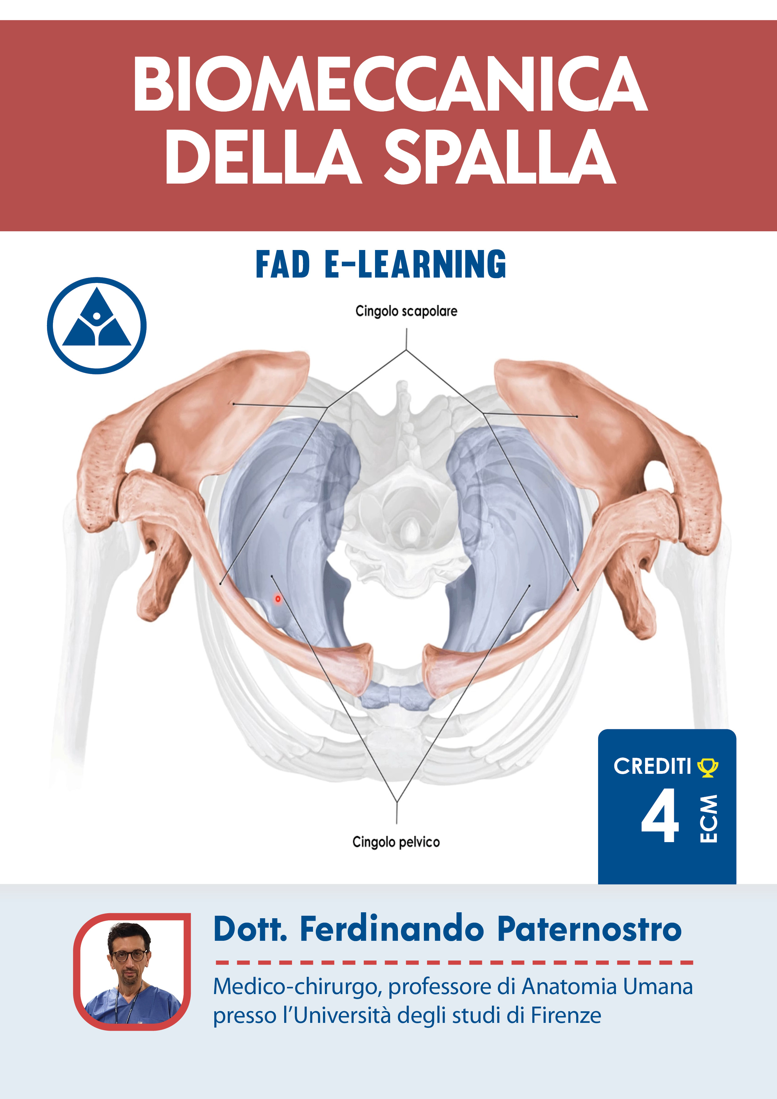 L'articolazione della spalla rappresenta, nell'ambito dell'anatomia e della biomeccanica, un argomento molto utile per la comprensione delle complesse dinamiche di movimento che presiedono alle attività motorie del corpo umano. La spalla è facilmente soggetta a traumi e infortuni vista la sua estrema mobilità e allo stesso tempo bassa stabilità. Molto spesso si va incontro a queste problematiche a causa di cattive abitudini di vita quotidiana come la sedentarietà, per un uso monotono e ripetitivo della spalla in attività poco varie dal punto di vista dell'esplorazione dei movimenti globali, di scarsa conoscenza di quelle che sono le pratiche e le manovre di carattere protettivo e preventivo da mettere in atto prima che insorga il problema. Lo scopo di questo corso a distanza è quello di portare a una buona comprensione della struttura muscolare e articolare della spalla, illustrare poi le dinamiche di movimento e le sinergie di tutte le strutture che compongono il complesso spalla per un inquadramento finale squisitamente biomeccanico.