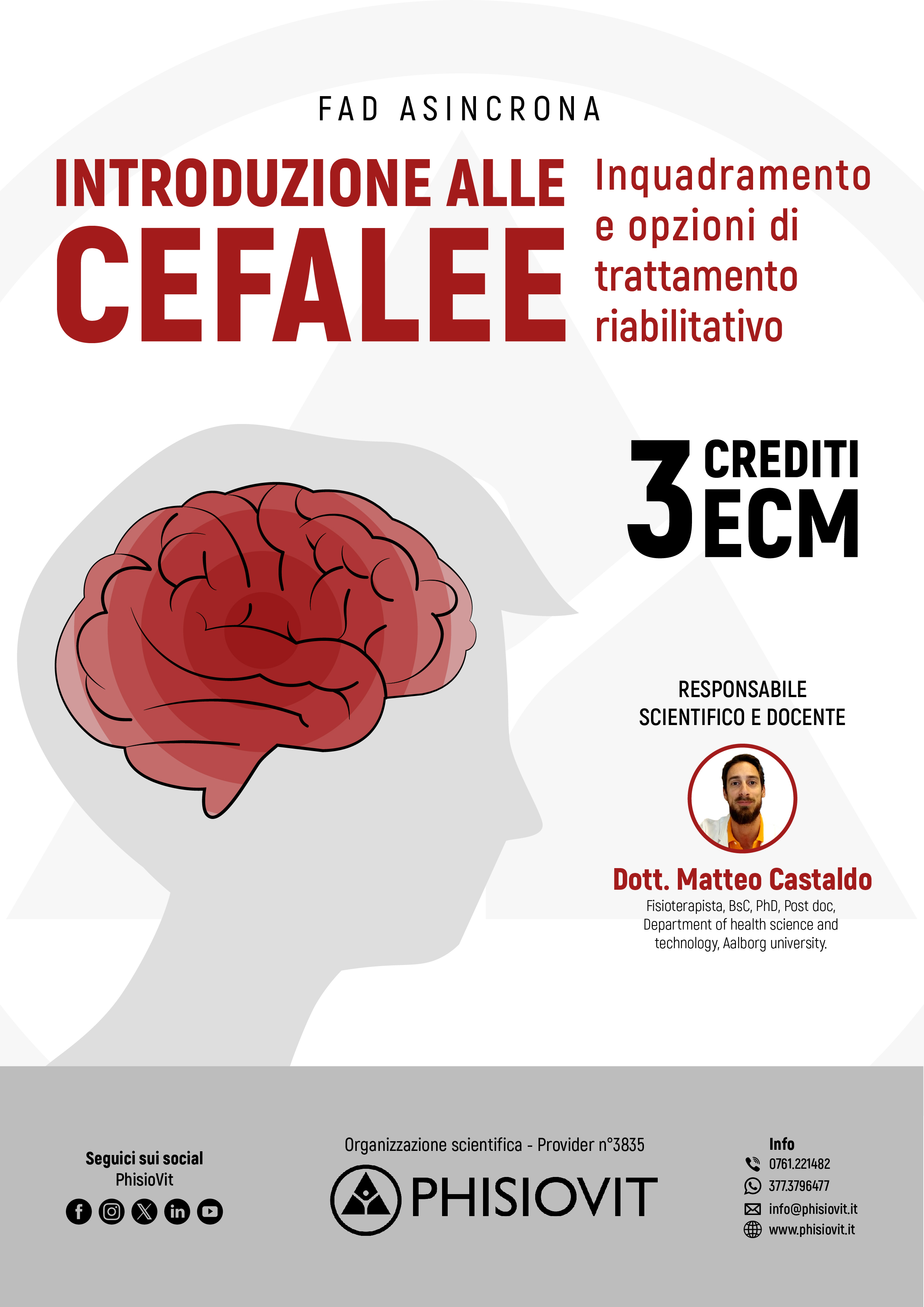 L'obiettivo di questo corso a distanza è quello di introdurre il partecipante alla classificazione internazionale delle cefalee, aiutarlo a imparare a riconoscere le caratteristiche delle forme principali, fargli meglio comprendere i modelli di eziopatogenesi, infine chiarire il ruolo della terapia manuale e di una valutazione muscoloscheletrica specifica nell'aiutare concretamente questa tipologia di pazienti.