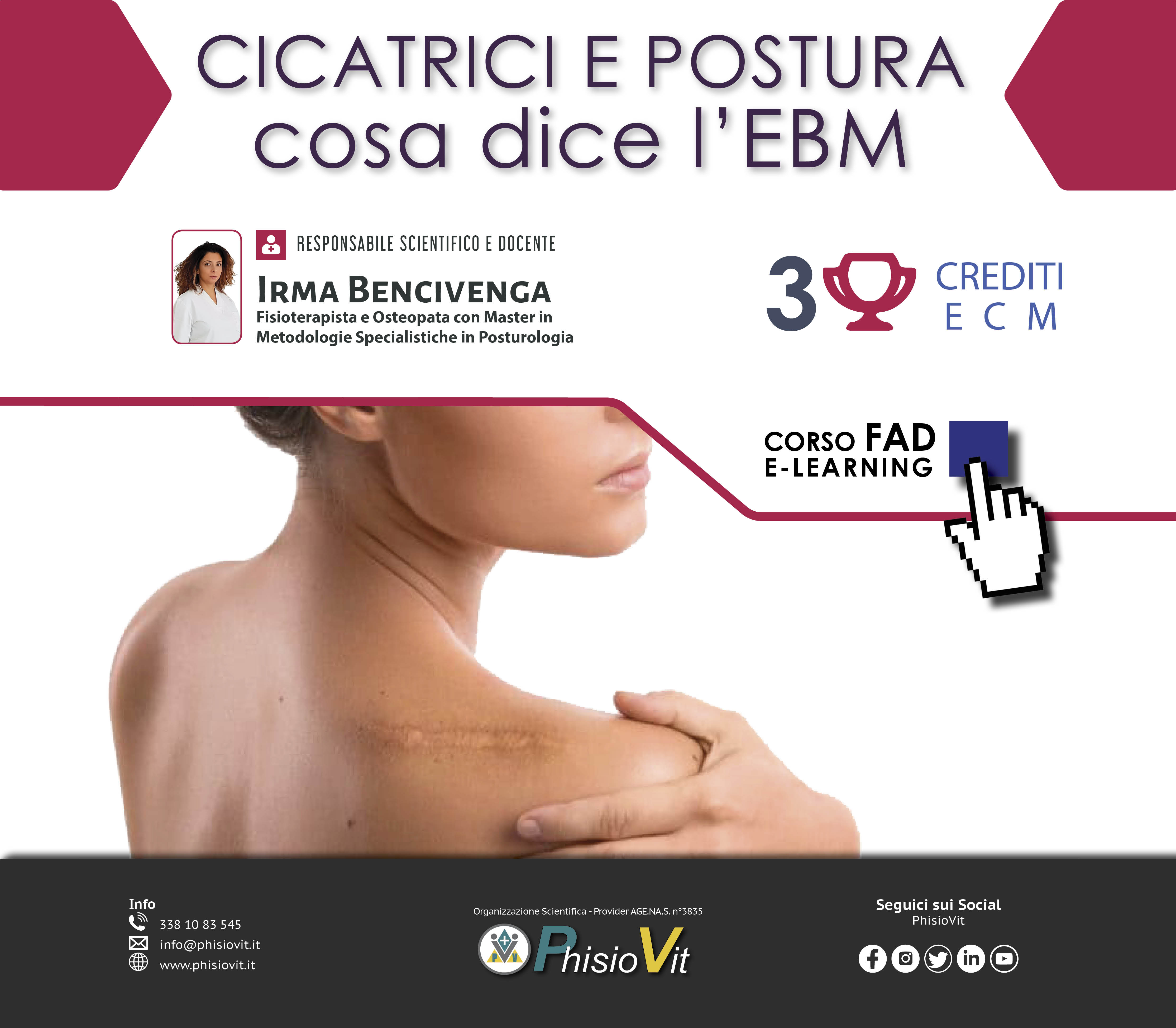 Questo corso dal titolo "Cicatrici e Postura: Cosa Dice l'EBM" è un prodotto didattico derivato da un Webinar registrato che l'autrice ha sostenuto per il pubblico: la registrazione viene così messa a disposizione in questo corso per intero e in formato originale lasciando invariata l'interazione che c'è stata durante la diretta e che ha compreso lezioni, domande dell'uditorio, sondaggi sull'evento e dibattito finale. Slide, video sui meccanismi posturali compensativi, schede commentate dal docente corredate da citazioni di letteratura e interazione con la platea hanno reso unico ed aggiornato questo evento a distanza in aula virtuale.