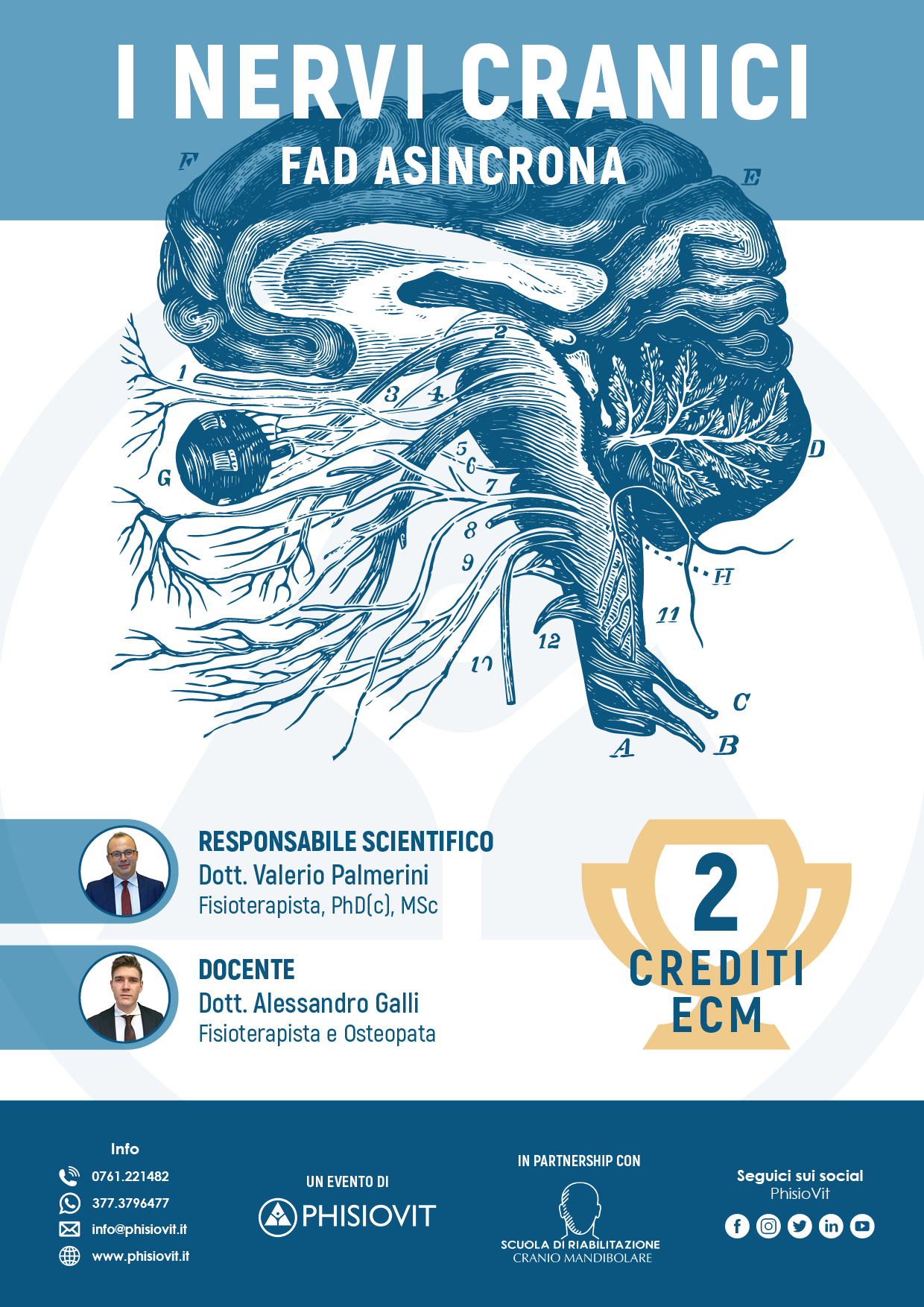 Questo corso in distance learning, realizzato in collaborazione con la Scuola di Riabilitazione Cranio Mandibolare, è un progetto formativo estremamente accurato che mira a formare i professionisti delle aree sanitarie e di quelle rieducative nello studio teorico dell'anatomia dei nervi cranici. Ideata e progettata interamente dal Dott. Alessandro Galli, fisioterapista e osteopata, questa formazione a distanza asincrona offre conoscenze dettagliate e precise sulla forma e sulla disposizione reciproca dei nervi cranici, con particolare riferimento a trigemino e faciale: tutto ciò è essenziale per comprendere i rapporti contratti dai nervi cranici con le strutture del copro umano in relazione ai disordini che possono investire l'ATM. In questo video corso viene pertanto illustrata l'anatomia dei nervi cranici in maniera chiara e briosa, ricorrendo a immersive interazioni in 3D.