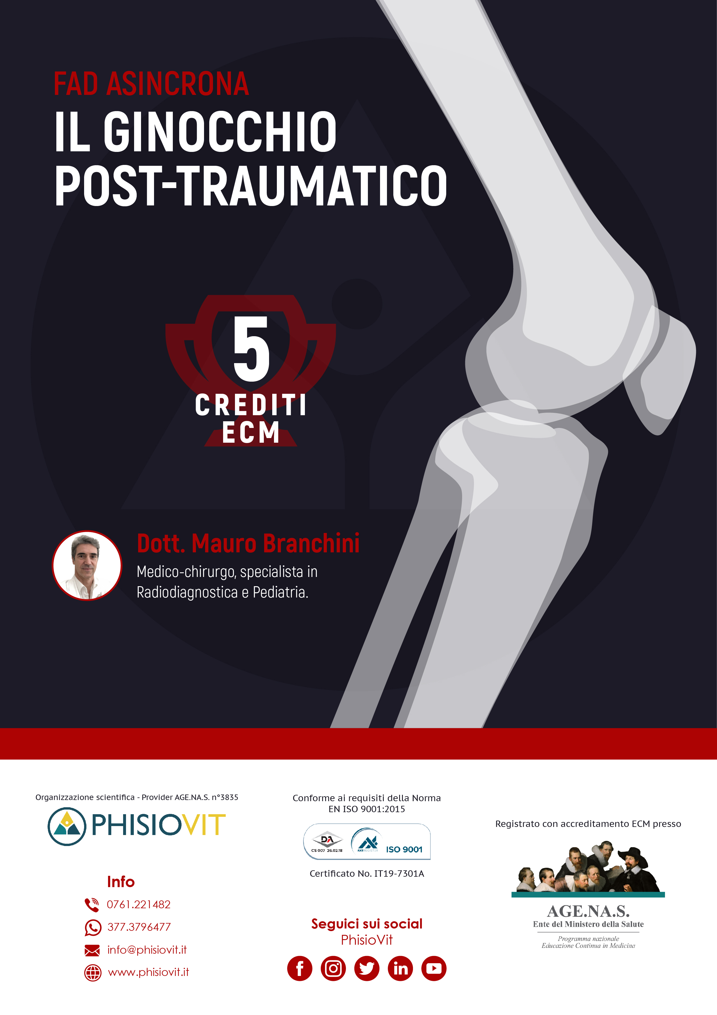 Questo corso a distanza dal titolo "Il Ginocchio Post Traumatico" è un prodotto didattico derivato da un Webinar registrato che l'autore ha sostenuto per il pubblico: la registrazione viene così messa a disposizione in questo corso per intero e in formato originale lasciando invariata l'interazione che c'è stata durante la diretta e che ha compreso lezioni, domande dell'uditorio e dibattito finale. Slide, immagini, video di tecniche ed esercizi, tabelle, grafici e schede commentate dal docente Dott. Mauro Branchini interagendo con la platea, hanno reso unico e aggiornato questo evento a distanza in aula virtuale. Il corso è imperniato sulla diagnostica per immagini del ginocchio post traumatico: prevede inizialmente un breve ripasso delle strutture anatomiche del ginocchio stesso con il loro orientamento nello spazio e con la loro funzione, illustrando successivamente cosa le diverse tecniche di imaging radiologico sono in grado di visualizzare. Scopo del corso è quello di fornire uno strumento per orientare il discente tra le diverse tecniche di indagine, al fine di consentirgli di scegliere quella più idonea a rispondere alle domande nel tentativo di evitare di richiedere esami non strettamente necessari con lunghi tempi di attesa e disagio per il paziente o, meglio ancora, poter rivalutare le indagini radiologiche già eseguite in passato dal paziente per individuare piccoli aspetti malformativi o patologici che avrebbero potuto condurre al quadro clinico in atto.