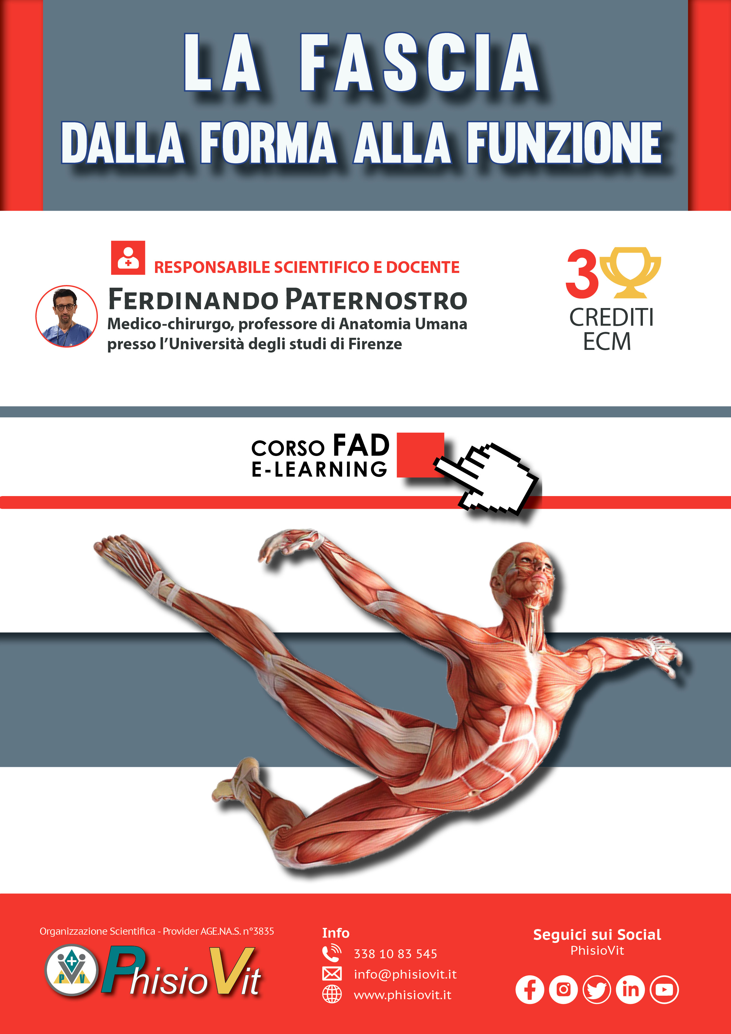 Questo corso dal titolo "La Fascia, dalla forma alla funzione" illustra l'anatomia funzionale della fascia: partendo dalle definizioni e dalle classificazioni più moderne, il corso si snoda esplicitando i concetti di tensegrità e istologia della fascia. Successivamente viene illustrata in dettaglio la fascia superficiale e profonda, quella epimisiale e aponeurotica, esplicitandone le proprietà biomeccaniche e il suo ruolo nella trasmissione meccanica della forza, in continuità con la struttura muscolare e tendinea. Per questo viene illustrata dettagliatamente l'anatomia di particolari regioni, del collo e del tronco. Questo progetto didattico, riccamente illustrato con iconografia specifica, si chiude con un focus sul ruolo esterocettivo e propriocettivo della fascia e sul moderno concetto di fasciatomero.