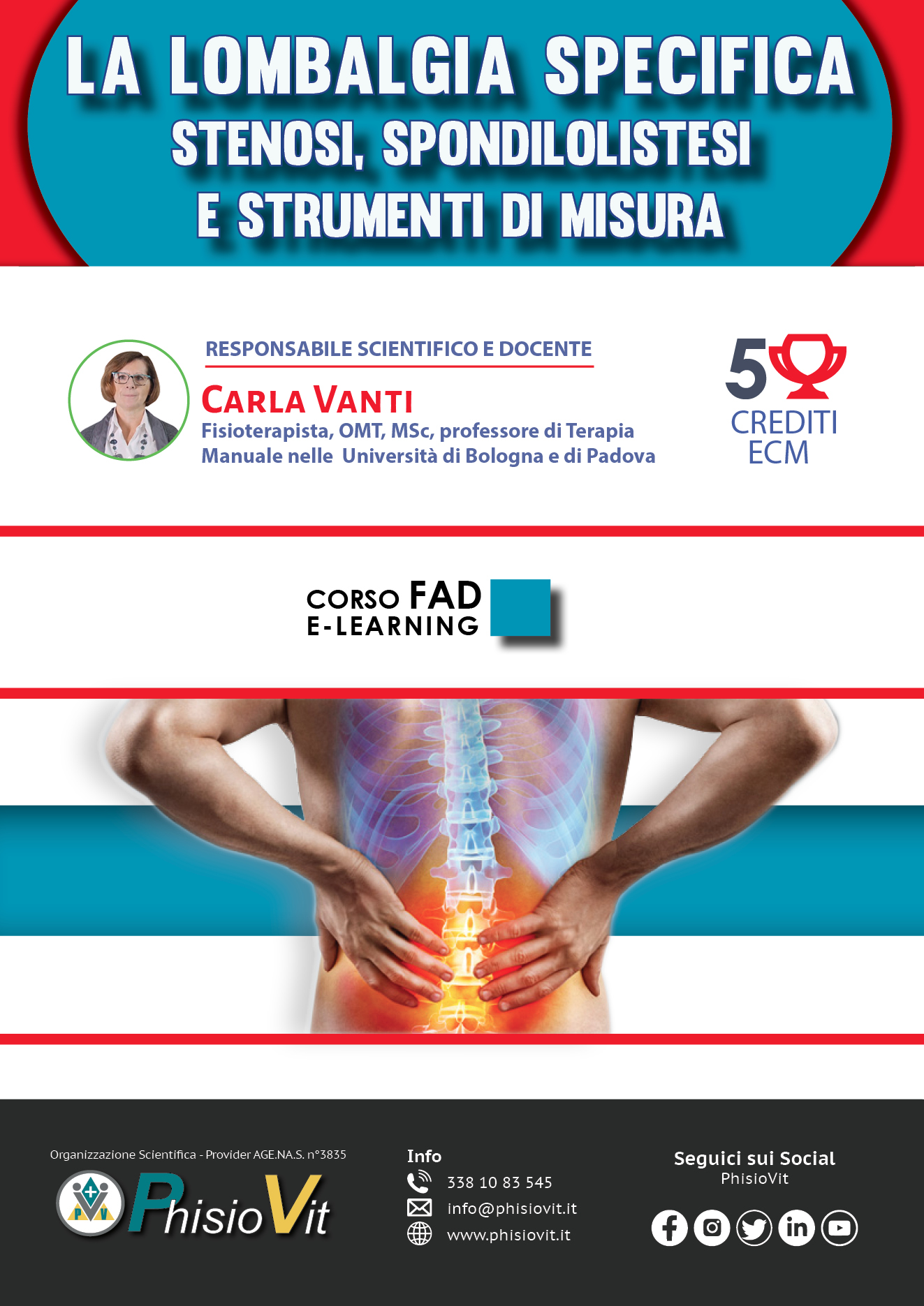 Questo corso di formazione a distanza dal titolo "La Lombalgia specifica: stenosi, spondilolistesi e strumenti di misura" indaga la stenosi lombare e la spondilolistesi con valutazione, trattemento e presentazione di casi clinici, offrendo in seguito spunti specifici con un'ampia sezione sui questionari di valutazione per il paziente lombalgico. La didattica si prefigge di esporre una modalità di approccio alla lombalgia specifica secondo l'Evidence Based Practice (EBP), di illustrare il processo e le modalità dell'esame del paziente, di dare indicazioni per il più efficace trattamento conservativo, di illustrare le principali procedure di trattamento, sia passivo che attivo, e di guidare il discente all'utilizzo di misure di outcome adeguate. Slide, schede, tabelle, grafici, video di test ed esercizi commentati dalla docente Dott.ssa Carla Vanti, rendono unico e aggiornato questo corso a distanza.
