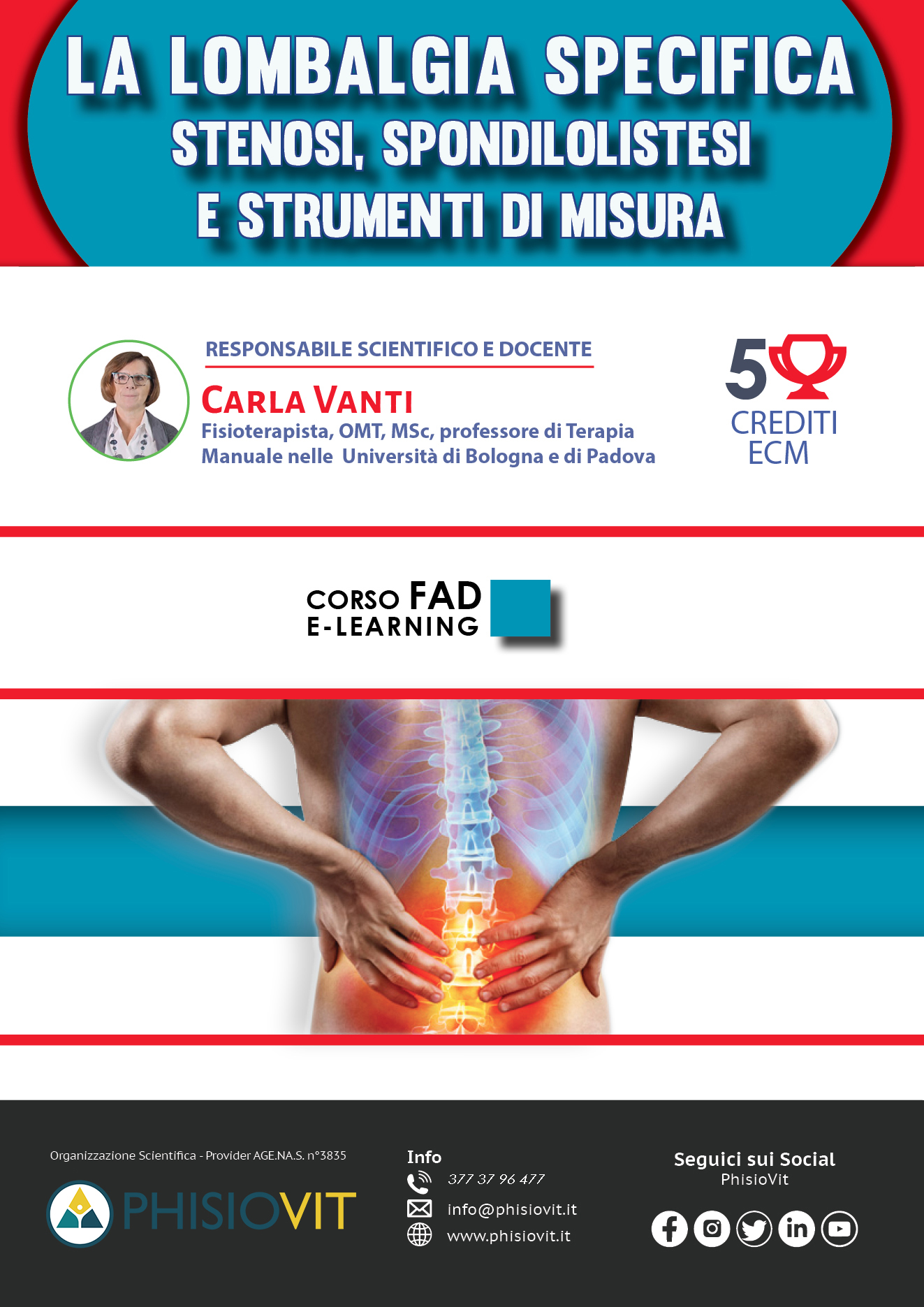 Questo corso di formazione a distanza dal titolo "La Lombalgia specifica: stenosi, spondilolistesi e strumenti di misura" indaga la stenosi lombare e la spondilolistesi con valutazione, trattemento e presentazione di casi clinici, offrendo in seguito spunti specifici con un'ampia sezione sui questionari di valutazione per il paziente lombalgico. La didattica si prefigge di esporre una modalità di approccio alla lombalgia specifica secondo l'Evidence Based Practice (EBP), di illustrare il processo e le modalità dell'esame del paziente, di dare indicazioni per il più efficace trattamento conservativo, di illustrare le principali procedure di trattamento, sia passivo che attivo, e di guidare il discente all'utilizzo di misure di outcome adeguate. Slide, schede, tabelle, grafici, video di test ed esercizi commentati dalla docente Dott.ssa Carla Vanti, rendono unico e aggiornato questo corso a distanza.