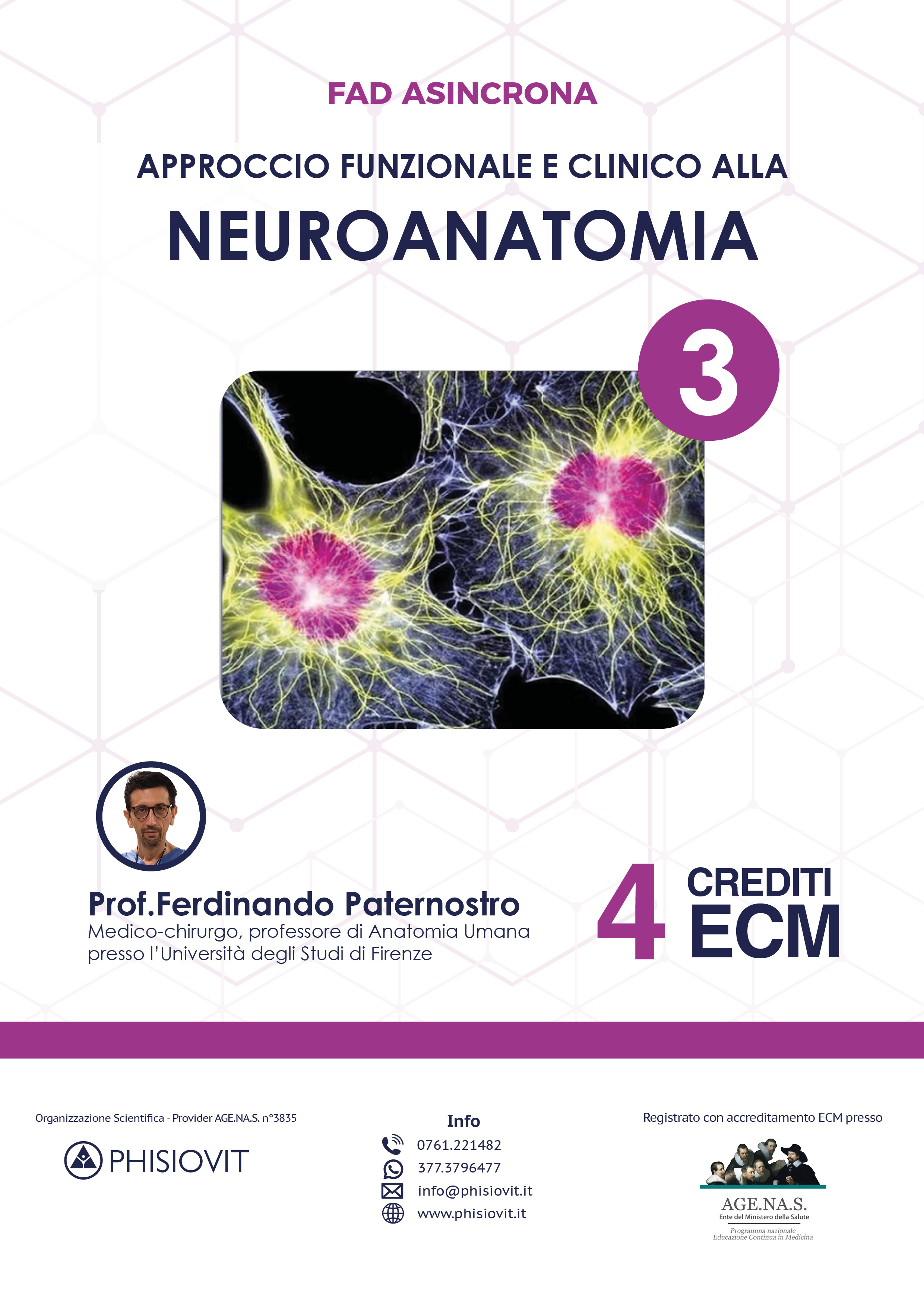 Un approccio funzionale e clinico alla Neuroanatomia è un progetto formativo che si compone di tre parti di cui questa terza unità didattica si intitola "Un approccio funzionale e clinico alla Neuroanatomia 3: cervelletto, vie di senso e di moto, lesioni midollari". Questo percorso didattico è stato ideato e progettato interamente dal Prof. Dr. Ferdinando Paternostro al fine di diffondere sia le basi concettuali per la definizione delle alterazioni posturali e di movimento che si manifestano nelle diverse patologie neurologiche, sia le basi per la definizione dei principi dell'esame clinico della sensibilità, dei riflessi, del tono muscolare, della coordinazione e dell'equilibrio. La didattica dei tre corsi facenti parte dell'intero pacchetto formativo, si divide in quattro grandi blocchi: