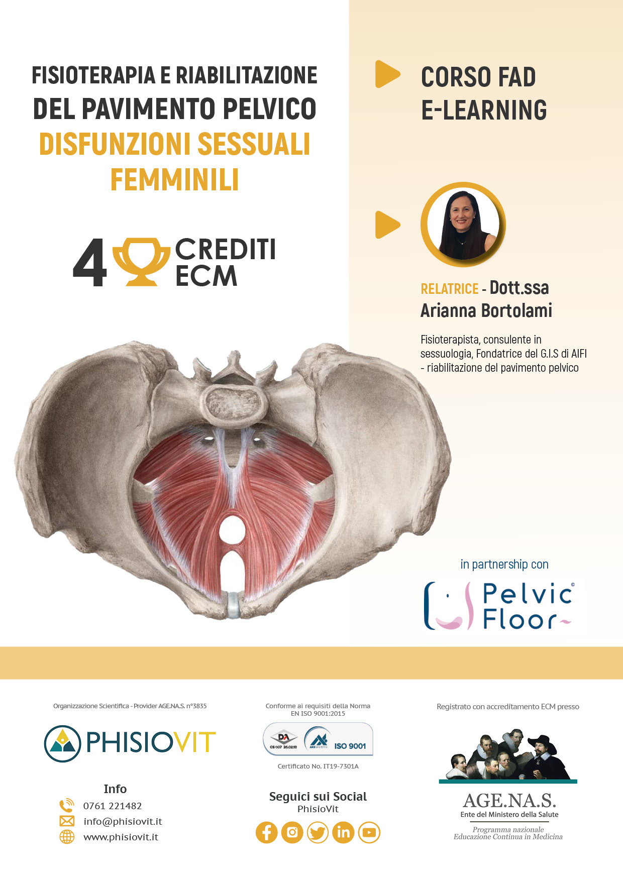 Questo corso dal titolo "Fisioterapia e Riabilitazione del Pavimento Pelvico nelle Disfunzioni Sessuali Femminili" è un prodotto didattico derivato da un webinar registrato che l'autrice ha sostenuto per il pubblico: la registrazione viene così messa a disposizione in questo corso per intero e in formato originale lasciando invariata l'interazione che c'è stata durante la diretta e che ha compreso lezioni, domande dell'uditorio e dibattito finale. Le disfunzioni sessuali femminili costituiscono un sintomo che può peggiorare in modo importante la qualità di vita della donna e, di conseguenza, del partner e della famiglia, compromettendo così la sfera personale, e talvolta sociale, della donna che ne soffre. In alcuni casi tali condizioni sono così gravi da impedire la maternità, danneggiando così ulteriormente la vita della donna e di chi le vive accanto. Il riconoscimento delle disfunzioni sessuali femminili presuppone conoscenze nell'ambito della sessuologia, disciplina che si è sviluppata negli ultimi decenni. Il pavimento pelvico costituisce uno degli elementi della funzione sessuale e la sua compromissione può essere causa primaria o secondaria della disfunzione sessuale. Ma con quali sintomi si manifestano questi disturbi? Come si effettua la diagnosi? E quali sono i trattamenti gold standard? Ne parliamo in questa FAD asincrona con la Dott.ssa Arianna Bortolami, una delle maggiori esperte italiane in questo argomento.
