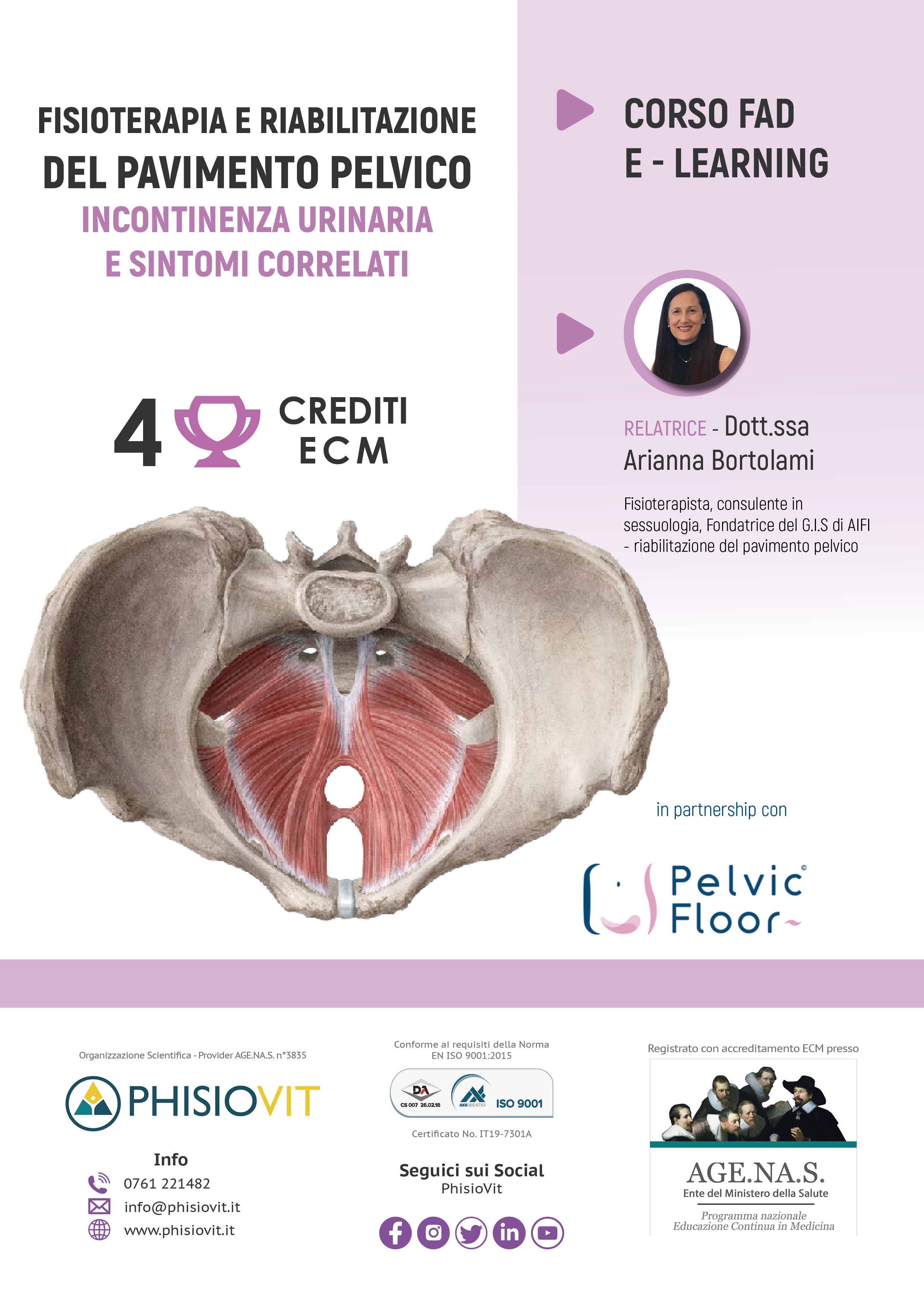 Questo corso dal titolo "Fisioterapia e Riabilitazione del Pavimento Pelvico nell'Incontinenza Urinaria e Sintomi Correlati" è un prodotto didattico derivato da un webinar registrato che l'autrice ha sostenuto per il pubblico: la registrazione viene così messa a disposizione in questo corso per intero e in formato originale lasciando invariata l'interazione che c'è stata durante la diretta e che ha compreso lezioni, domande dell'uditorio e dibattito finale. La fisioterapia e la riabilitazione del pavimento pelvico costituiscono la prima opzione terapeutica per l'incontinenza urinaria di origine non neurogena. Questo sintomo, definito come la perdita involontaria di urina, riguarda intimamente la qualità di vita: chi ne soffre spesso riferisce sensazioni di imbarazzo, frustrazione, disagio nei confronti dell'ambiente circostante e delle persone che gli stanno vicino. A ciò possono conseguire alterazioni della vita affettiva, relazionale e sociale. Inoltre, l'incontinenza può avere un costo economico considerevole. Negli ultimi decenni la letteratura internazionale ha dedicato molta attenzione a questo problema: in questo modo l'evidenza scientifica e le prove ottenute hanno dimostrato l'efficacia delle varie opzioni terapeutiche, tra le quali sono appunto comprese la fisioterapia e la riabilitazione del pavimento pelvico. Esse sono costituite da una serie di tecniche e strumenti, che all'interno di un processo di ragionamento clinico e alla luce del paradigma dell'evidence based practice, permettono la gestione del sintomo relativo all'incontinenza urinaria di origine non neurogena. Ma con quali sintomi si manifesta questo disturbo? Come si effettua la diagnosi? E quali sono i trattamenti gold standard? Ne parliamo in questa FAD asincrona con la Dott.ssa Arianna Bortolami, una delle maggiori esperte italiane in questo argomento.