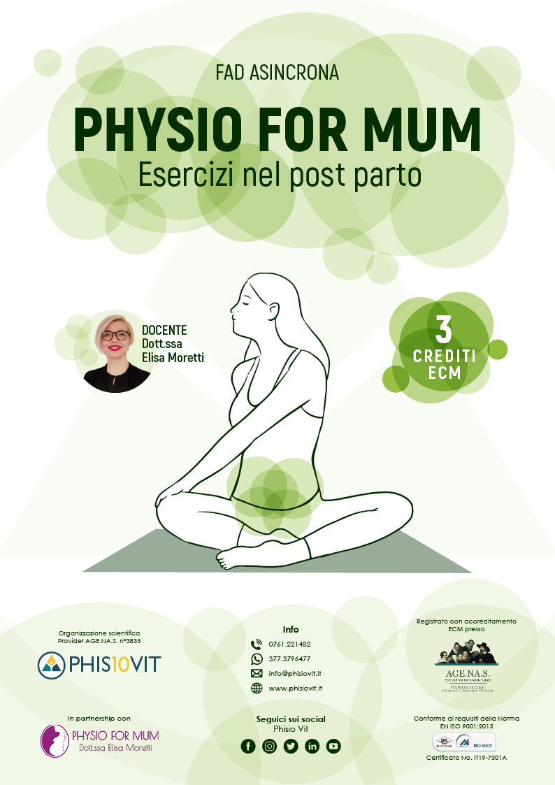 Physio For Mum 2 è un approfondimento su esercizi sia a corpo libero che con piccoli attrezzi, mirati e adattati per le donne nella fase del post parto: il focus è posto sul pavimento pelvico, sulla mobilità di bacino, della colonna e sul rinforzo globale. Durante la formazione il discente avrà una panoramica ampia su quali possono essere gli esercizi da somministrare alla paziente sia in studio che a casa come autotrattamento. Questo corso FAD asincrono in distance learning si divide in una prima parte teorica sulle principali patologie che possono emergere nel post parto e sul razionale degli esercizi proposti, mentre la seconda parte è molto più ampia e contiene esercizi pratici in varie posizioni e con diverse tipologie di materiale per poter lavorare su: pavimento pelvico, mobilità di bacino, mobilità e rinforzo della colonna, rinforzo globale. Questo progetto formativo nasce dall'esigenza di trovare una serie di esercizi adatti alla donna in gravidanza e nel post parto, trasformando tutto ciò in un percorso per poterla supportare sotto tutta la sfera che riguarda le disfunzioni muscoloscheletriche. Si tratta di un percorso formativo che nasce dall'esperienza della Dott.ssa Elisa Moretti nel campo dell'esercizio riabilitativo e in quello del pilates terapeutico durante la sua maternità: la gravidanza in lockdown, l'ha portata ad ideare un percorso di prevenzione facile da riprodurre presso le strutture sanitarie e gli studi professionali, ma anche un valido supporto per l'educazione all'esercizio e agli autotrattamenti da svolgere a casa. È un corso pensato per tutte le figure sanitarie che lavorano con donne in gravidanza e post parto: un approfondimento su esercizi sia a corpo libero che con piccoli attrezzi, mirato e adattato alle donne in maternità con focus sul post parto.