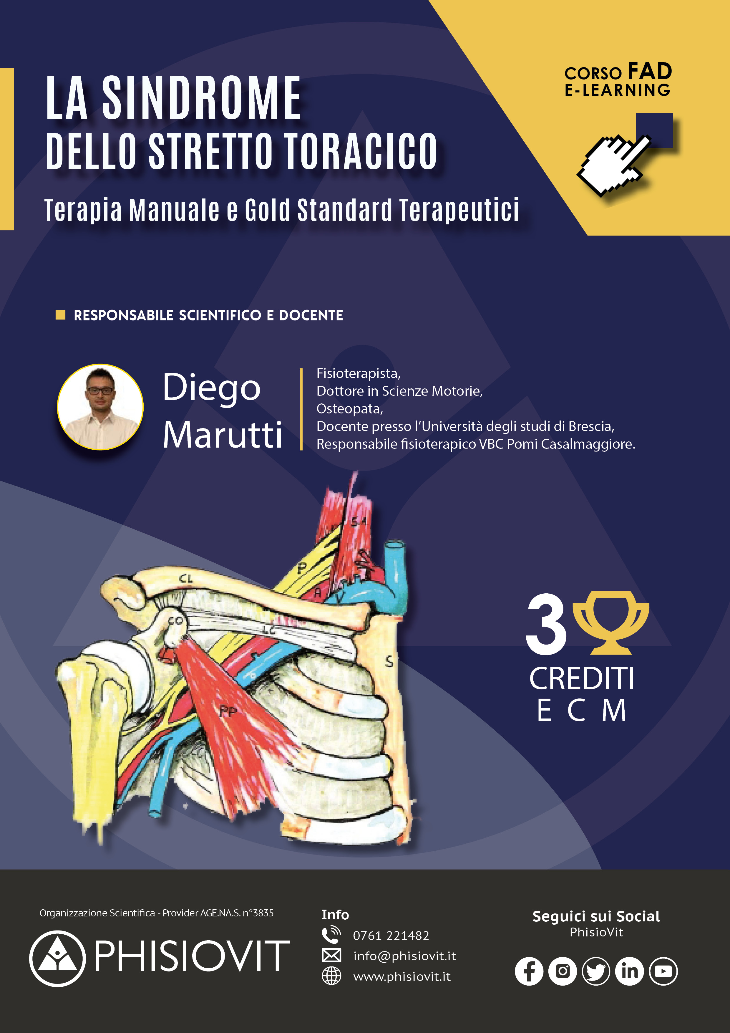 La sindrome dello stretto toracico è da sempre una delle patologie più problematiche dal punto di vista diagnostico-terapeutico. Le peculiarità anatomiche e biomeccaniche dello stretto toracico superiore, rendono spesso difficoltoso l'inquadramento clinico del paziente. L'insidiosità dei sintomi inoltre, genera spesso nei pazienti un significativo impairment funzionale sia nell'attività sportiva che lavorativa. Il corso, dal titolo "La Sindrome dello Stretto Toracico, Terapia Manuale e Gold Standard Terapeutici", nasce con lo scopo di trasmettere allo studente le più importanti ed aggiornate nozioni di trattamento manuale ed esercizio terapeutico sulla sindrome dello stretto toracico. Particolare attenzione è rivolta allo studio dell'anatomia funzionale, all'esame anamnestico e alla valutazione differenziale al fine di impostare un set terapeutico efficace. Slide, esercizi e tecniche manuali, test, tabelle, grafici e schede commentati dal docente Dott. Diego Marutti, rendono unico e aggiornato questo corso a distanza.