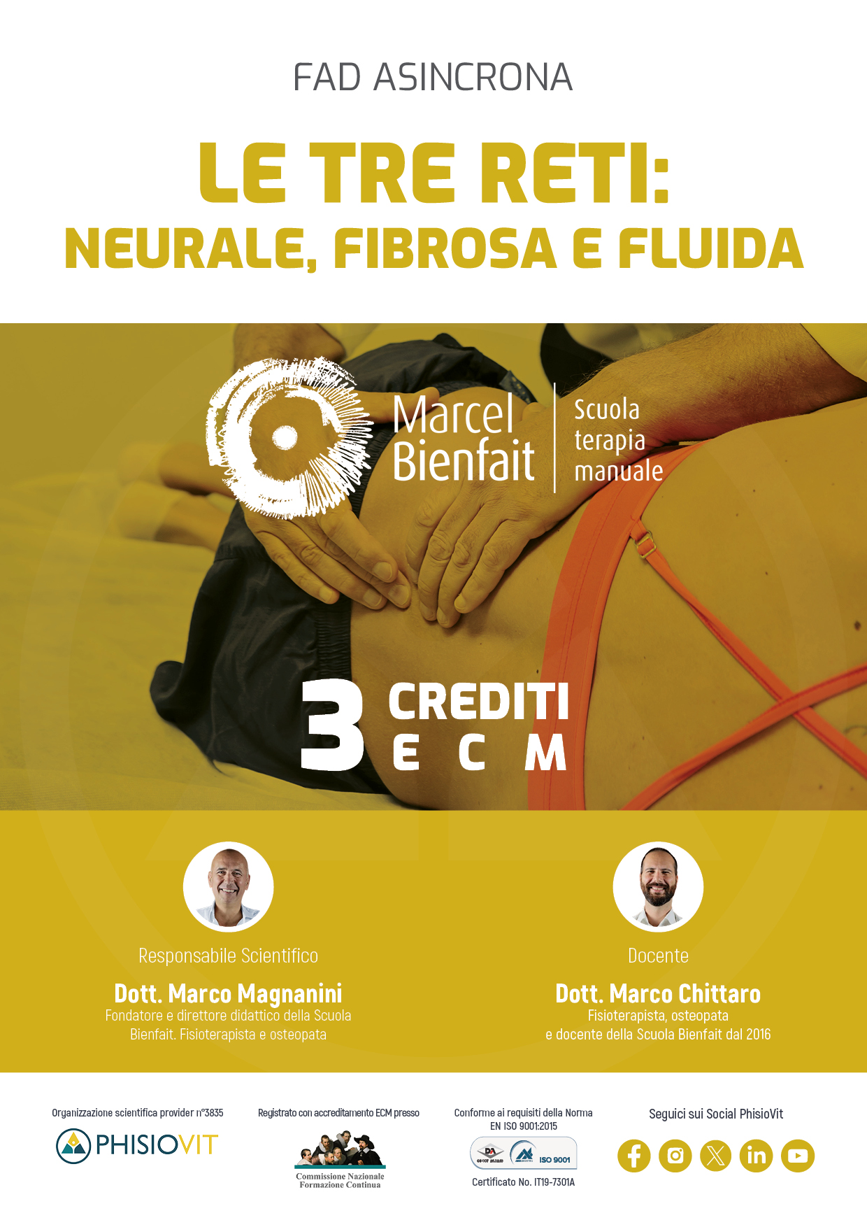 Il docente è il Dott. Marco Chittaro, fisioterapista e osteopata, docente presso la Scuola Bienfait dal 2016. Fondata nel 2010, la Scuola Marcel Bienfait è l’unico ente ufficialmente autorizzato a insegnare il Metodo Bienfait, un modello di pensiero clinico basato sull’osservazione, sull’ascolto e sulla centralità della persona. Per approfondire l’offerta formativa e i percorsi disponibili è possibile consultare la landing page dedicata ai corsi della Scuola di Terapia Manuale Marcel Bienfait.