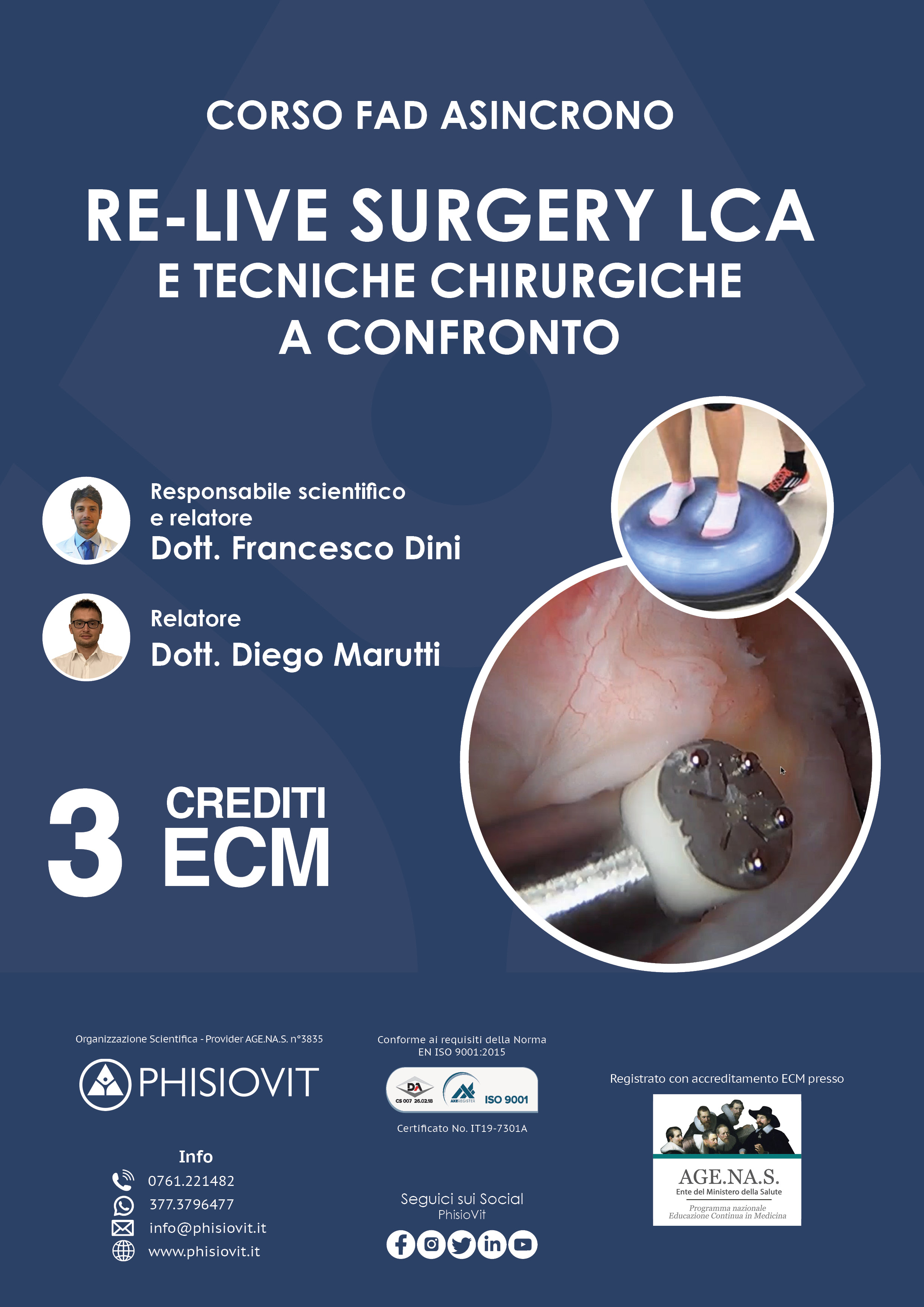Le tecniche di ricostruzione del LCA, quale graft utilizzare e come dettare i tempi della riabilitazione, continuano ad essere un tema molto dibattuto. In questa FAD asincrona il Dott. Francesco Dini, medico-chirurgo specialista in ortopedia e traumatologia, mostra in Re - Live Surgery un suo intervento di ricostruzione di LCA approfondendo e analizzando nel dettaglio la tecnica di ricostruzione chirurgica, l'anatomia dell'articolazione del ginocchio e le diverse prospettive terapeutiche. Particolare attenzione viene data alla valutazione differenziale e all'apprendimento dei principali test diagnostici e di intervento. Questo corso dal titolo "Re - Live Surgery LCA: Chirurgia e Riabilitazione a Confronto" è un prodotto didattico derivato da un webinar registrato che gli autori hanno sostenuto per il pubblico: la registrazione ed il successivo montaggio vengono così messi a disposizione per intero e in formato originale lasciando invariata l'interazione che c'è stata durante la diretta e che ha compreso lezioni, domande dell'uditorio e dibattito finale.