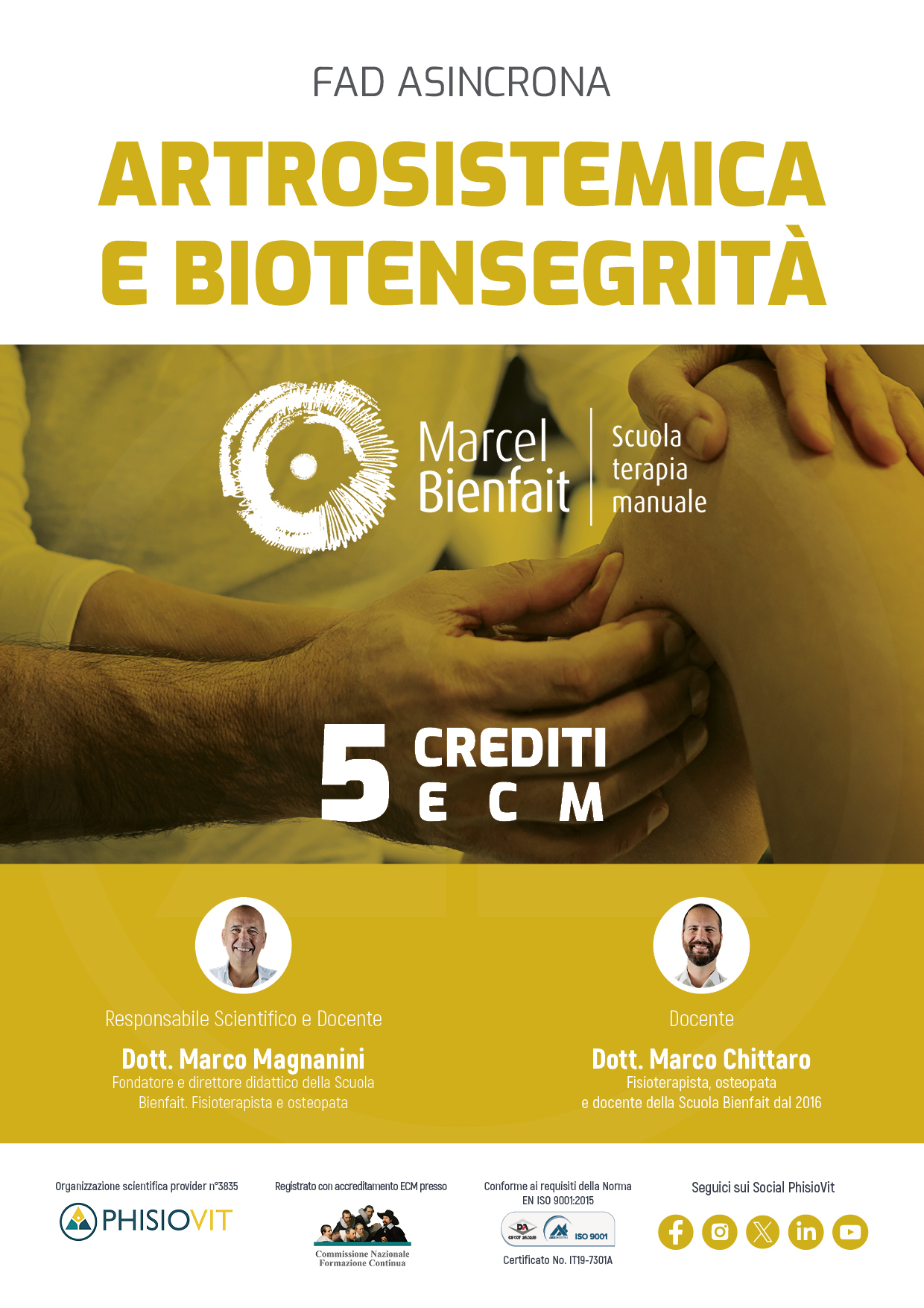 Il corpo docente è composto dal Dott. Marco Magnanini, fisioterapista e osteopata, allievo diretto di Marcel Bienfait e punto di riferimento per la trasmissione autentica del metodo. Attualmente ricopre il ruolo di Direttore Didattico della Scuola Bienfait, e dal Dott. Marco Chittaro, fisioterapista e osteopata, docente presso la Scuola Bienfait dal 2016. Fondata nel 2010, la Scuola Marcel Bienfait è l’unico ente ufficialmente autorizzato a insegnare il Metodo Bienfait, un modello di pensiero clinico basato sull’osservazione, sull’ascolto e sulla centralità della persona. Per approfondire l’offerta formativa e i percorsi disponibili è possibile consultare la landing page dedicata ai corsi della Scuola di Terapia Manuale Marcel Bienfait.