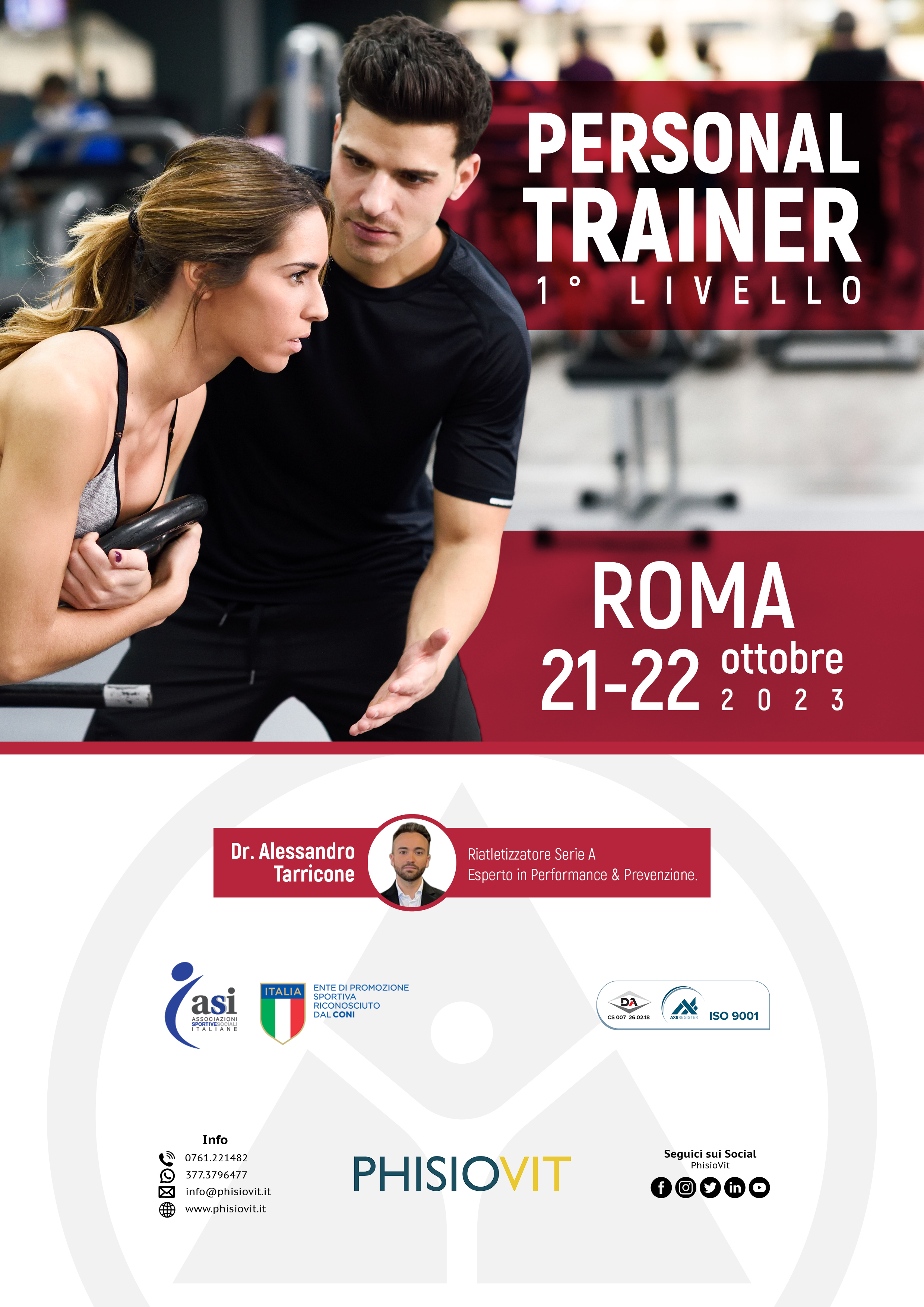L'evento è riconosciuto da ASI – Associazioni Sportive e Sociali Italiane, ente di promozione sportiva riconosciuto dal CONI tra i più importanti d'Italia: ciò consente di acquisire, una volta terminato il corso, la certificazione di Istruttore Personal Trainer di 1° Livello che attesta le competenze acquisite. Questa certificazione non rappresenta soltanto una chiara possibilità per chi cerca un'occupazione, ma anche un valido aggiornamento per chi già esercita la professione di Personal Trainer. Al termine del corso è previsto un esame teorico-pratico, al superamento del quale viene rilasciata una certificazione PhisioVit, società affiliata con ASI – Associazioni Sportive e Sociali Italiane, ente di promozione sportiva riconosciuto dal CONI. Su richiesta del candidato viene rilasciato il diploma nazionale (guarda qui il fac-simile) emesso direttamente da ASI – Associazioni Sportive e Sociali Italiane, ente di promozione sportiva riconosciuto dal CONI con qualifica Istruttore Personal Trainer di 1° Livello, sport ginnastica e disciplina attività sportiva ginnastica finalizzata alla salute ed al fitness. Il diploma nazionale viene rilasciato congiuntamente al tesserino tecnico (quest'ultimo con validità biennale, guarda qui il fac-simile fronte e guarda qui il fac-simile retro) che riporta la qualifica tecnica ed è corredato da foto tessera se inviata dal partecipante a info@phisiovit.it. Inoltre il partecipante che supera l'esame viene inserito nell'Albo dei tecnici ASI – Associazioni Sportive e Sociali Italiane, ente di promozione sportiva riconosciuto dal CONI.