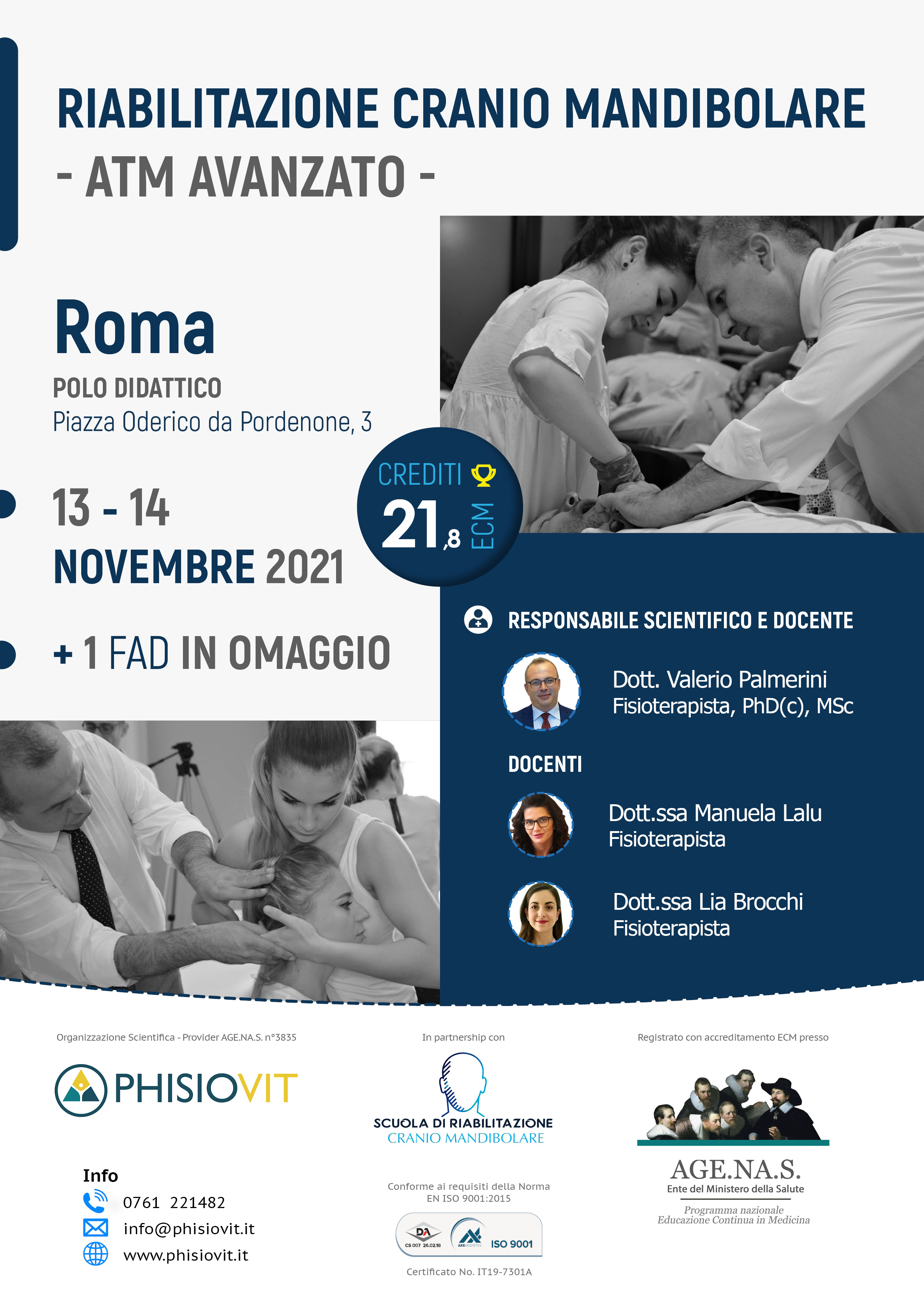 I vari livelli della scuola di riabilitazione cranio mandibolare offrono piani formativi completi per professionisti sanitari sui disordini temporomandibolari, dolore orofacciale e loro riabilitazione multidisciplinare, permettendo al discente una crescita ampia, graduale ed accurata. Durante la mattina del primo giorno del corso avanzato, dopo un riepilogo del livello precedente, viene approfondita la terza branca del trigemino, quella mandibolare, seguita dall'esecuzione di tecniche profonde come le Intraoral Myofascial Techniques; viene anche proposta la tecnica di riduzione manuale del disco dislocato, contestualizzata nell'adeguata fase terapeutica. Nel pomeriggio poi, spazio alla seconda branca del trigemino, al palato con l'illustrazione delle famiglie di bite più utilizzati e loro funzione. La prima giornata si conclude con la spiegazione dell'Axis II, col completamento del protocollo valutativo Diagnostic Criteria già introdotto nel livello base e con la distribuizione dei questionari utili ad un più ampio e corretto inquadramento del paziente con disordine temporomandibolare anche sotto un'ottica biopsicosociale. La mattina del secondo giorno è dedicata alle relazioni dell'ATM con lingua, osso ioide e reciproche influenze, accompagnata da una ricca parte pratica di tecniche manuali per i muscoli ioidei e integrata da semplici ma efficaci integrazioni di terapia miofunzionale. Nel pomeriggio poi, si completa l'approfondimento del nervo trigemino con la prima branca, quella oftalmica, impreziosito dall'esecuzione dei test neurovisuoposturali. La giornata si conclude con il capitolo dedicato al nervo faciale e ad alcune delle strategie riabilitative emergenti sia da un punto di vista clinico che di letteratura scientifica.